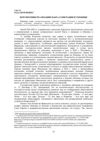 11 декабря Комиссия посвятила свое первое в новом политическом цикле Сообщение «гибридным угрозам на восточных границах ЕС» и инструментализации миграции, т. е. «использованию мигрантов как оружия для дестабилизации государствчленов и всего Евросоюза». Сообщение, представленное членом Комиссии Хенной Вирккунен, ответственной за технологический суверенитет, безопасность и демократию, призывает государства-члены вводить исключительные меры в случае роста миграционного притока, не дожидаясь вступления в силу в 2026 г. Регламента о кризисных и форс-мажорных ситуациях. В соответствии с регламентом, страны ЕС уполномочены, например, «ограничить осуществление права на убежище, но на очень строгих условиях и в установленных законом пределах». В частности, по просьбе Польши (которая рассматривает вопрос о принятии специального национального закона о противодействии инструментализации миграции, установила металлический барьер вдоль границы с Белоруссией и усилила патрулирование) государства-члены получат право принять законодательство, позволяющее отступать от правил предоставления убежища и Хартии основных прав.