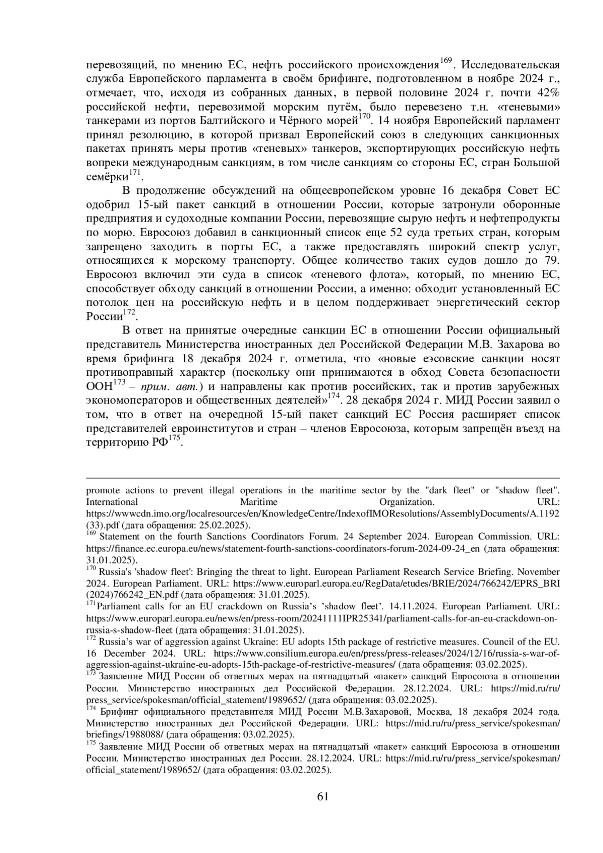 15. Заявление МИД России об ответных мерах на пятнадцатый “пакет” санкций Евросоюза в отношении России // Министерство иностранных дел Российской Федерации. 28.12.2024.