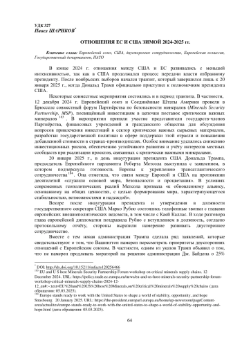 Некоторые совместные мероприятия состоялись и в период транзита. В частности, 12 декабря 2024 г. Европейский союз и Соединённые Штаты Америки провели в Брюсселе совместный форум Партнёрства по безопасности минералов (Minerals Security Partnership, MSP), посвящённый инвестициям в цепочки поставок критически важных минералов 183. В мероприятии приняли участие представители государств-членов Партнёрства, финансовых учреждений и гражданского общества для обсуждения вопросов привлечения инвестиций в сектор критически важных сырьевых материалов, разработки государственной политики в сфере поддержки этой отрасли и повышения добавленной стоимости в странах-производителях. Особое внимание уделялось снижению инвестиционных рисков, обеспечению устойчивого развития и учёту интересов местных сообществ при реализации проектов, связанных с критически важными минералами