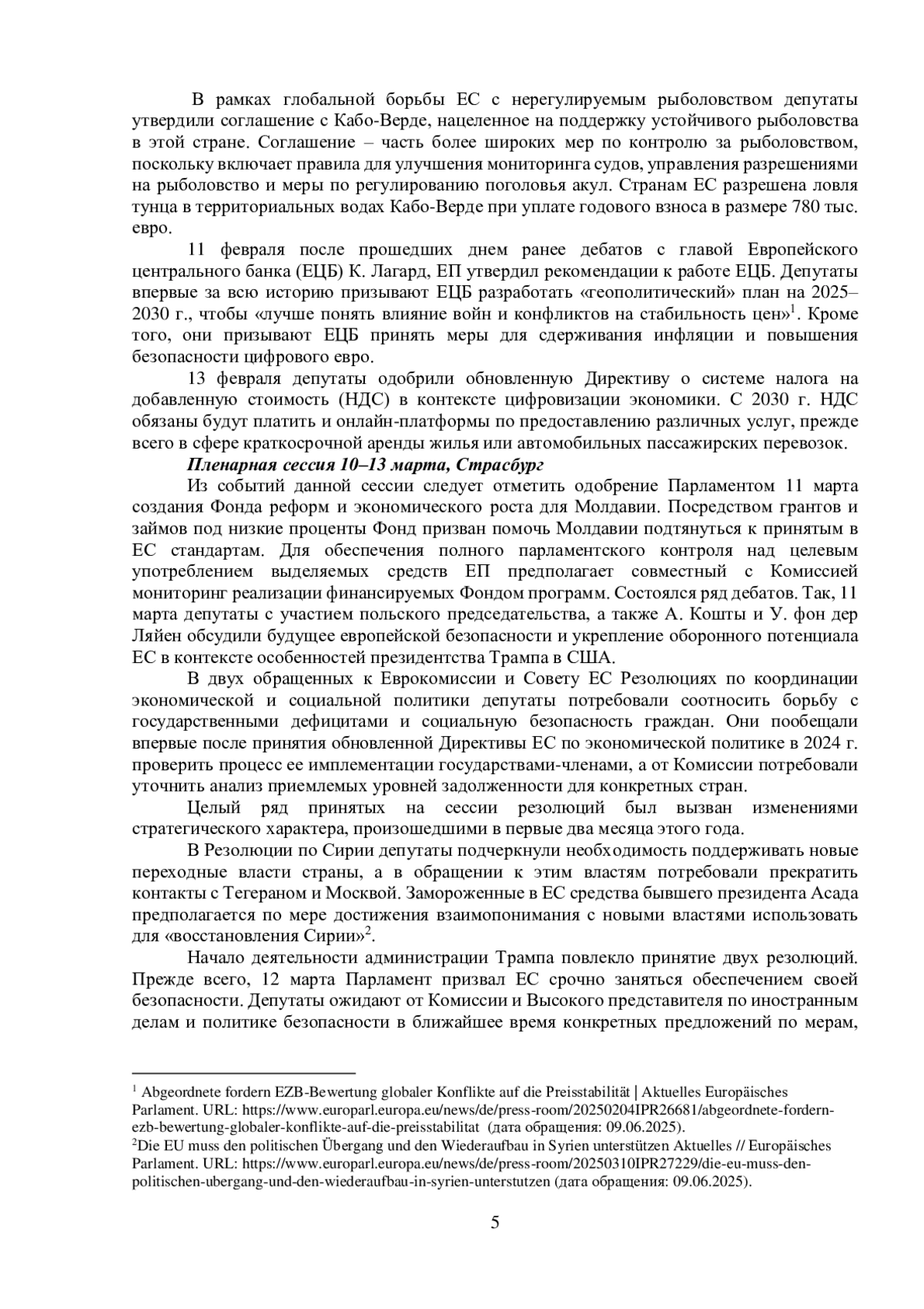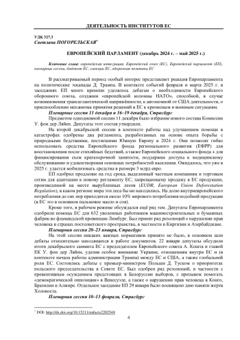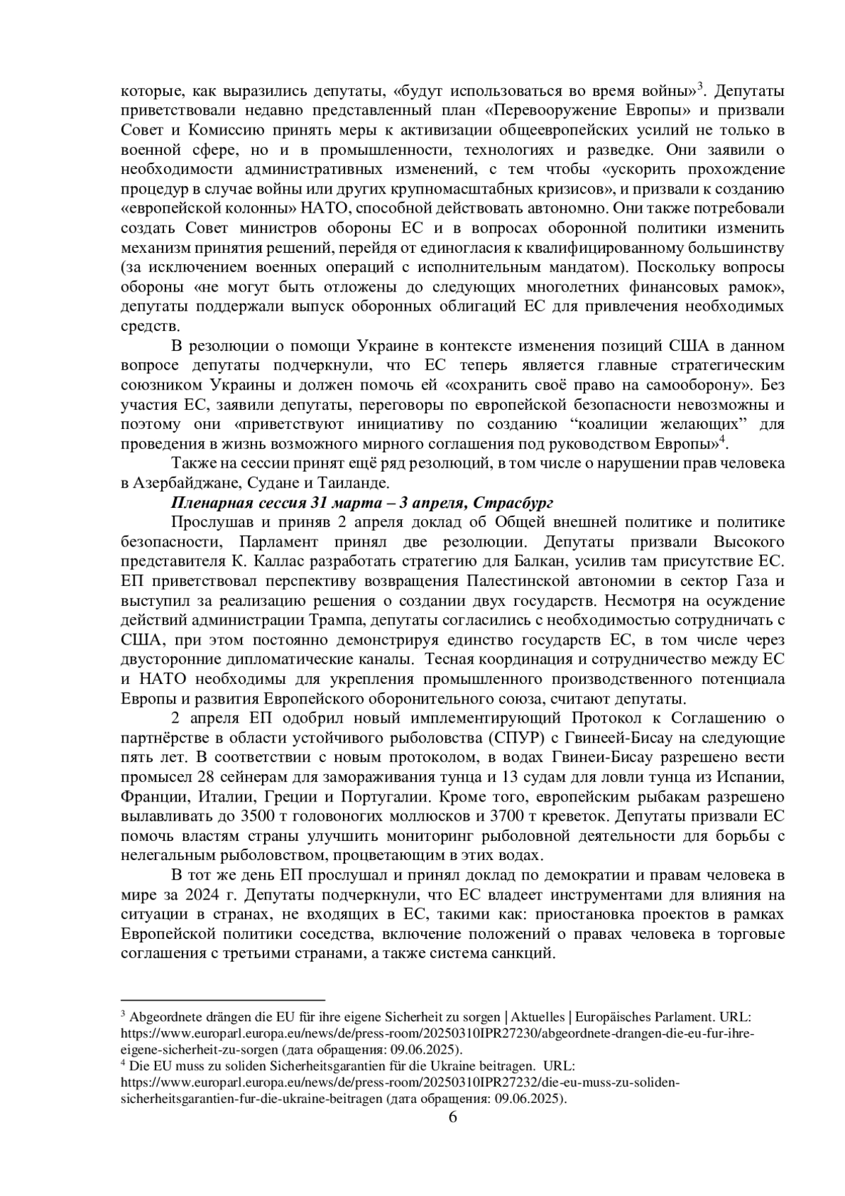 В рассматриваемый период особый интерес представляет реакция Европарламента на политические эскапады Д. Трампа. В контексте событий февраля и марта 2025 г. в заседаниях ЕП много времени уделялось дебатам о необходимости Европейского оборонного союза, создании «европейской колонны НАТО», способной, в случае возникновения трансатлантической напряжённости, к автономной от США деятельности, о приспособлении механизма принятия решений в ЕС к кризисным и военным ситуациям