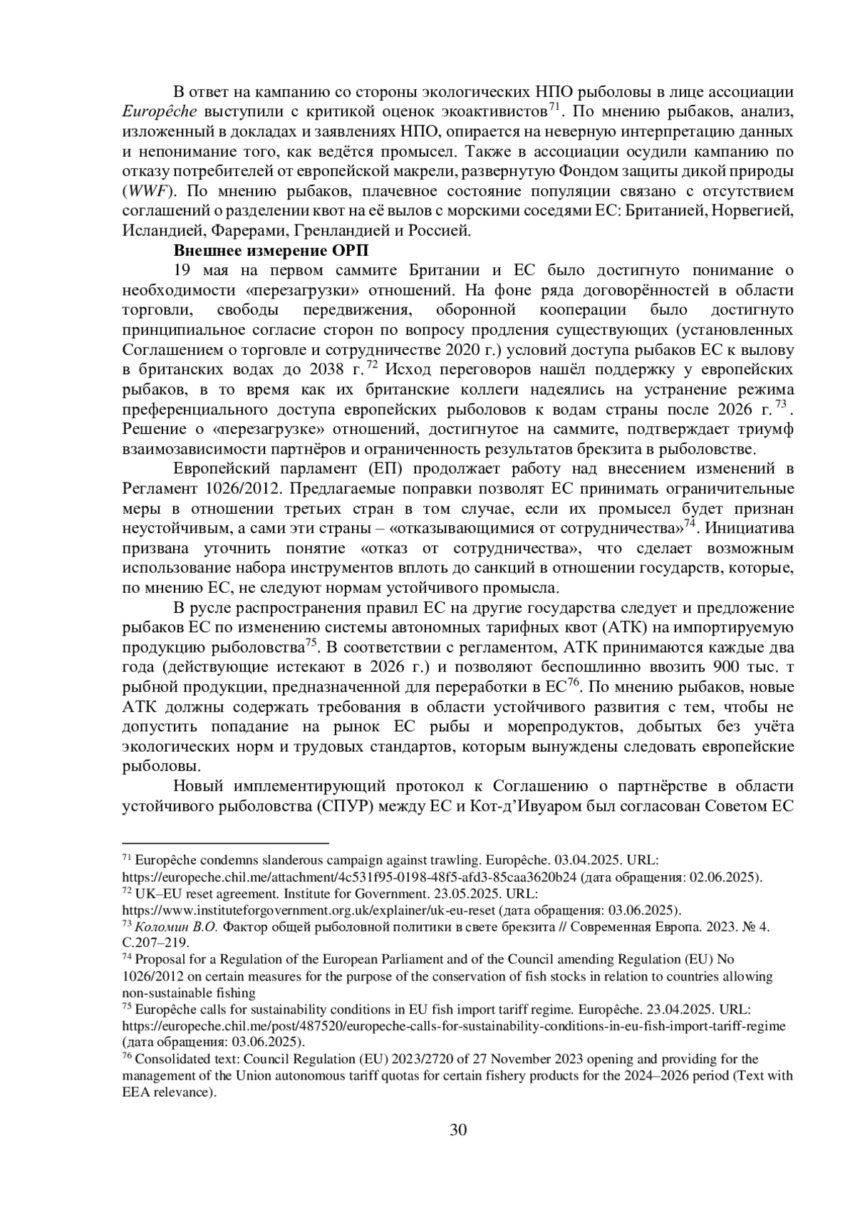 1. Коломин В.О. Фактор общей рыболовной политики в свете брекзита // Современная Европа. 2023. № 4. С. 207-219. EDN: BXMCRR