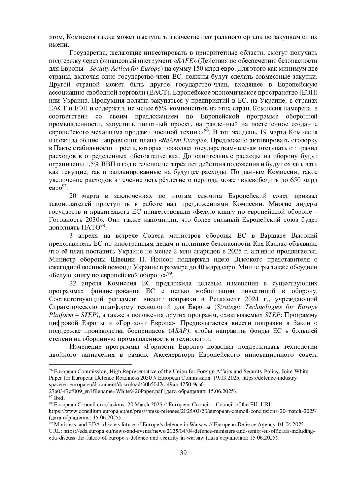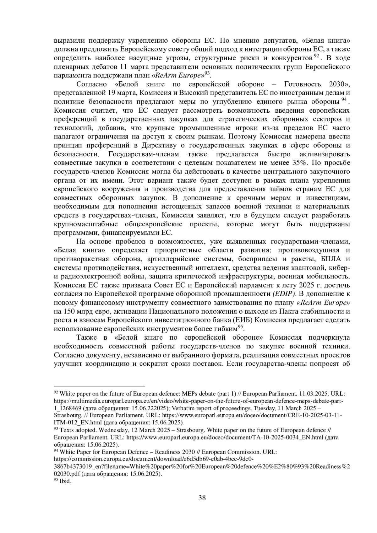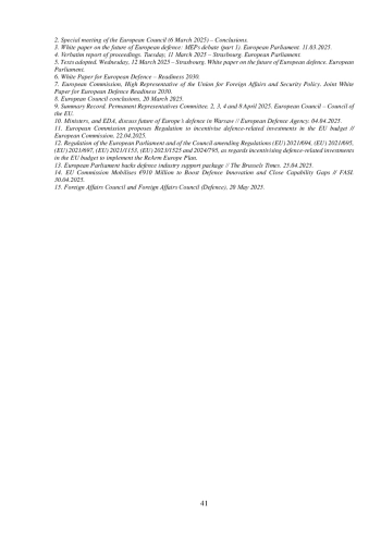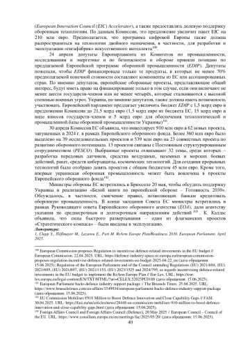 Весной 2025 г. продолжились поиск новых средств и разработка инструментов финансирования оборонной сферы в Европейском союзе, что отразилось на процессе стратегического планирования. 4 марта председатель Комиссии ЕС У. фон дер Ляйен представила свои предложения по повышению обороноспособности ЕС в плане «Перевооружение Европы» (Reinforcement European Armament and Manufacturing – «ReArm Europe»). Суть предложений – позволить государствам-членам тратить больше, прежде всего за счёт «совместного заимствования» – нового инструмента для предоставления 150 млрд евро в виде займов государствам-членам. Ожидается, что на эти деньги страны ЕС закупят средства противовоздушной и противоракетной обороны, артиллерийские системы, ракеты и боеприпасы, БПЛА и системы противодействия им. Председатель Комиссии также предлагает совместные закупки для повышения совместимости оборудования. Второй вариант, предложенный главой Комиссии У. фон дер Ляйен – перенаправить на оборонные нужды средства в рамках текущих Многолетних финансовых рамок, включая использование программ Фонда сплочения. Комиссия считает необходимым также мобилизовать другие каналы для увеличения частных инвестиций, что будет включать Союз сбережений и инвестиций (Savings and Investment Union). В совокупности предлагаемые действия, по данным Комиссии, могут обеспечить оборонному сектору до 800 млрд евро