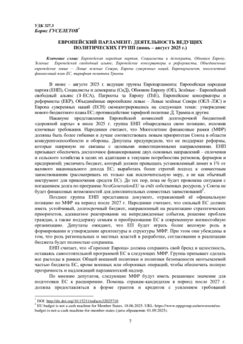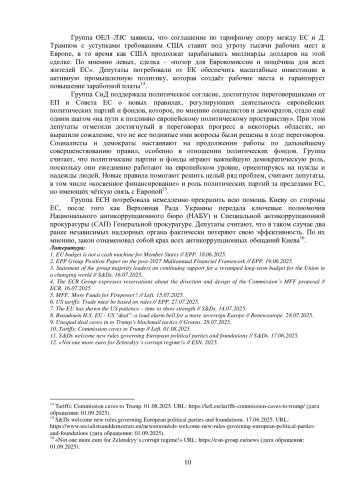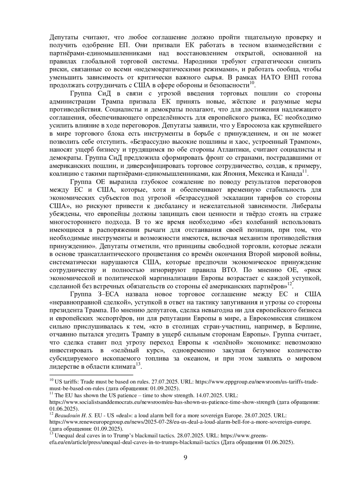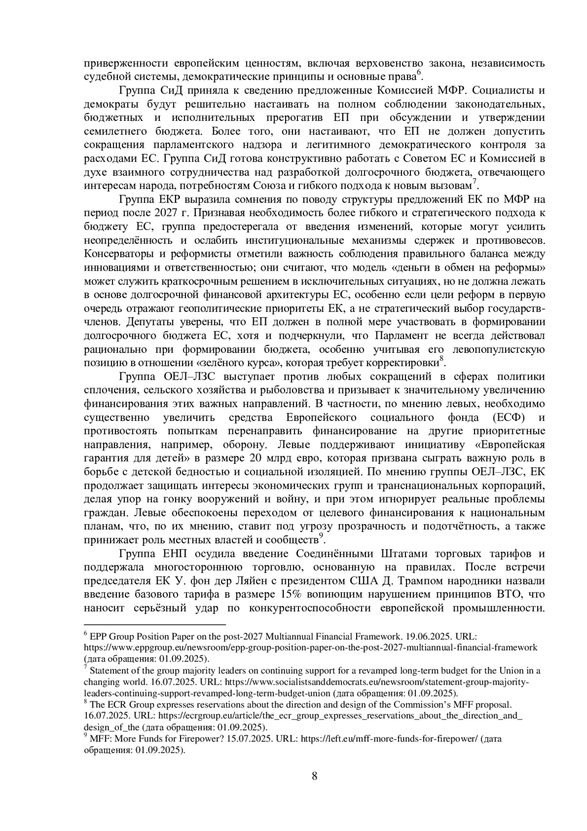 В июне – августе 2025 г. ведущие группы Европарламента: Европейская народная партия (ЕНП), Социалисты и демократы (СиД), Обновим Европу (ОЕ), Зелёные – Европейский свободный альянс (З–ЕСА), Патриоты за Европу (ПзЕ), Европейские консерваторы и реформисты (ЕКР), Объединённые европейские левые – Левые зелёные Севера (ОЕЛ–ЛЗС) и Европа суверенных наций (ЕСН) сконцентрировались на следующих темах: утверждение нового бюджетного плана ЕС; противодействие тарифной политике Д. Трампа и другие