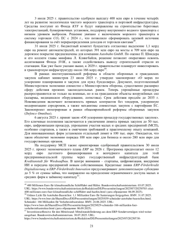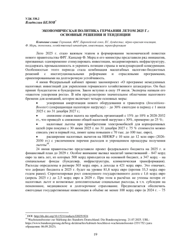 Лето 2025 г. стало важным этапом в формировании экономической повестки нового правительства ФРГ. Канцлер Ф. Мерц и его министры представили ряд инициатив, призванных одновременно стимулировать инвестиции, модернизировать инфраструктуру, поддержать промышленность и укрепить позиции страны в международной конкуренции. Особенностью этого периода стала комбинация масштабных налогово-бюджетных решений с институциональными реформами и отраслевыми программами, ориентированными на долгосрочную устойчивость