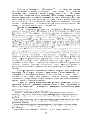 Завершается работа по внесению изменений в регламент ЕС 1026/2012 77. Он позволит вводить ограничения в отношении третьих стран, если их промысел будет признан «неустойчивым», а сами эти страны – «отказывающимися от сотрудничества». После достижения компромисса между Советом ЕС и Европейским парламентом (ЕП) по вопросу критериев «отказа от сотрудничества» евродепутаты согласовали поправки на заседании 9 июля. Регламент несёт существенные риски для России. Наиболее трудным регионом соседства остаётся Балтийское море, экологическая ситуация в котором продолжает оставаться сложной. Так, на заседании Совета ЕС по сельскому хозяйству и рыболовству 24 июня представитель Латвии в очередной раз обвинил Россию в якобы чрезмерном вылове на Балтике