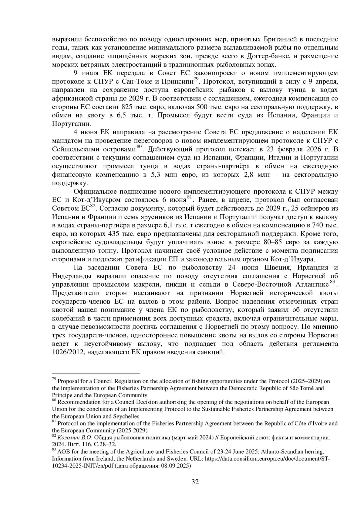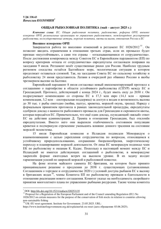 1. Коломин В.О. Общая рыболовная политика (март-май 2024) // Европейский союз: факты и комментарии. 2024. № 116. С. 28-32.