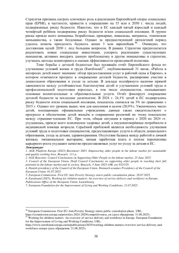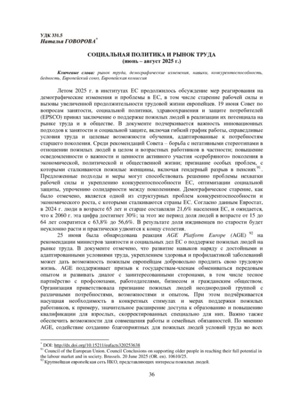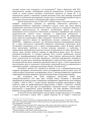 Летом 2025 г. в институтах ЕС продолжилось обсуждение мер реагирования на демографические изменения и проблемы в ЕС, в том числе старение рабочей силы и вызовы увеличенной продолжительности трудовой жизни европейцев. 19 июня Совет по вопросам занятости, социальной политики, здравоохранения и защите потребителей (EPSCO) принял заключение о поддержке пожилых людей в реализации их потенциала на рынке труда и в обществе. В документе подчеркивается важность инновационных подходов к занятости и социальной защите, включая гибкий график работы, справедливые условия труда и целевые возможности обучения, адаптированные к потребностям старшего поколения. Среди рекомендаций Совета – борьба с негативными стереотипами в отношении пожилых людей в целом и возрастных работников в частности; повышение осведомленности о важности и ценности активного участия «серебряного» поколения в экономической, политической и общественной жизни; признание особых проблем, с которыми сталкиваются пожилые женщины, включая гендерный разрыв в пенсиях 91. Предложенные подходы и меры могут способствовать решению проблемы нехватки рабочей силы и укреплению конкурентоспособности ЕС, оптимизации социальной защиты, упрочению солидарности между поколениями. Демографическое старение, как было отмечено, является одной из структурных проблем конкурентоспособности и экономического роста, с которыми сталкиваются страны ЕС. Согласно данным Евростат, в 2024 г. люди в возрасте 65 лет и старше составляли 21,6% населения ЕС, и ожидается, что к 2060 г. эта цифра достигнет 30%; за этот же период доля людей в возрасте от 15 до 64 лет сократится с 63,8% до 56,6%. В результате доля иждивенцев по старости будет неуклонно расти и практически удвоится к концу столетия.