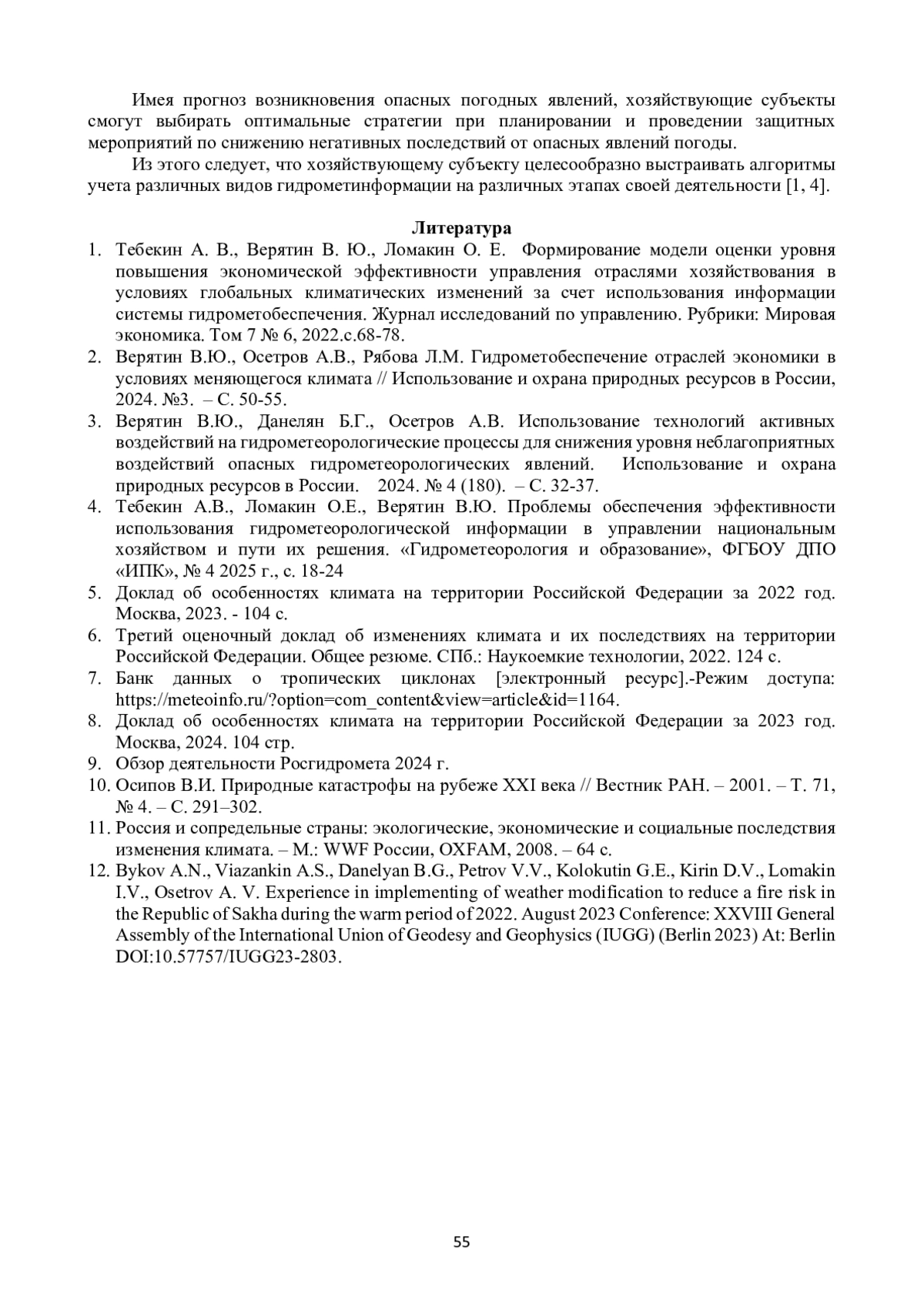 4. Тебекин А.В., Ломакин О.Е., Верятин В.Ю. Проблемы обеспечения эффективности использования гидрометеорологической информации в управлении национальным хозяйством и пути их решения. “Гидрометеорология и образование”, ФГБОУ ДПО “ИПК”, № 4 2025 г., с. 18-24.