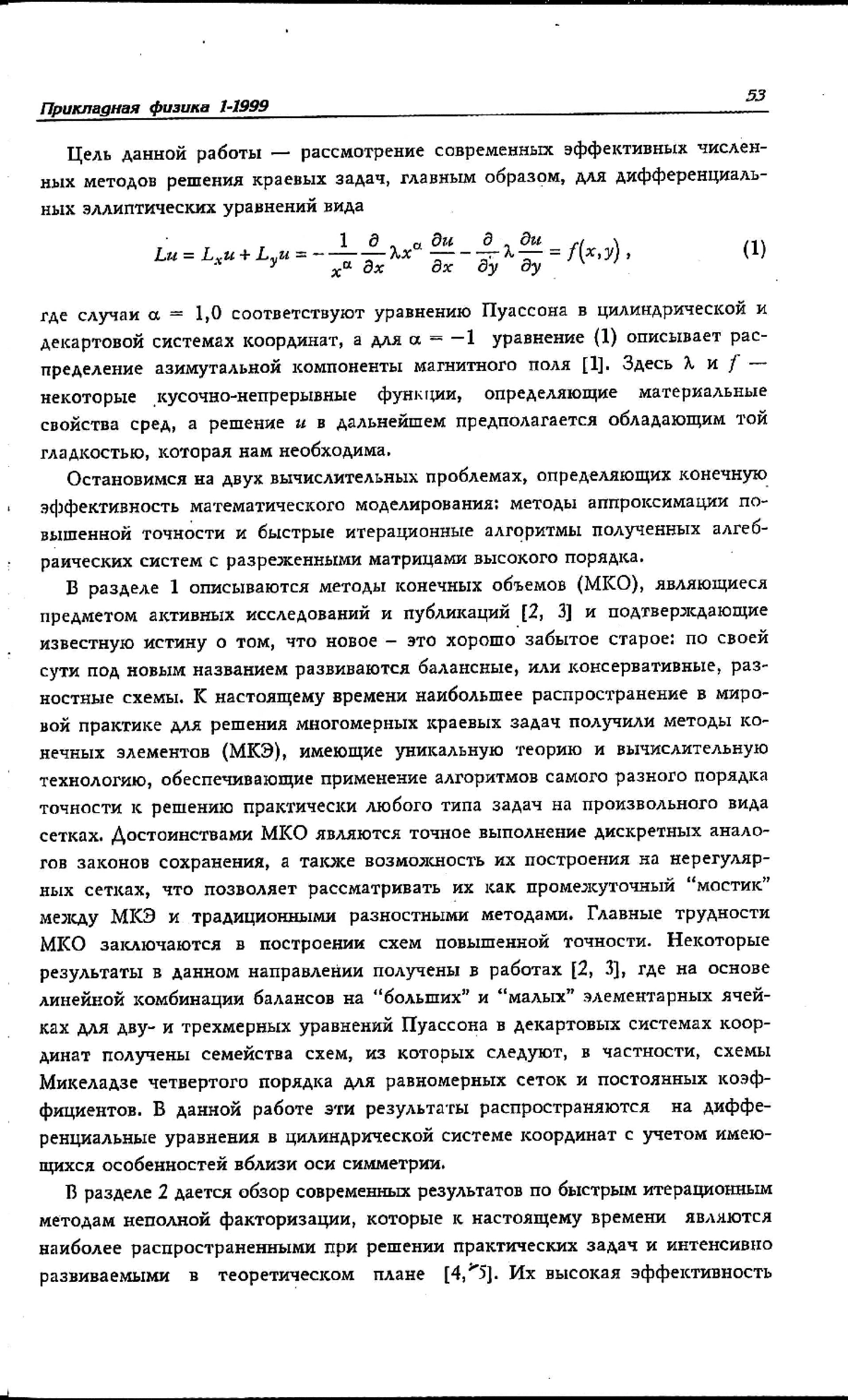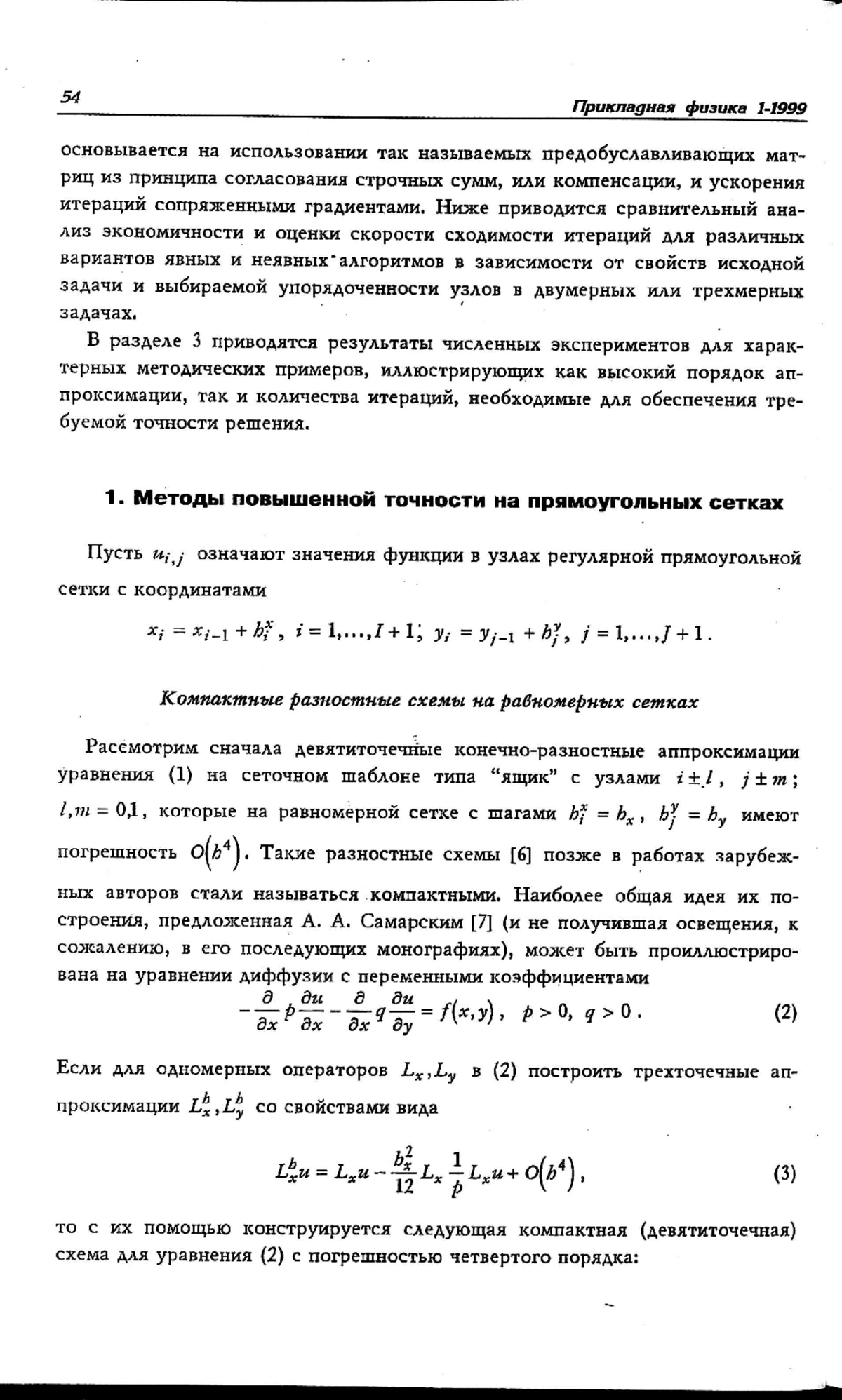 Рассмотрены эффективные численные методы для решения уравнения, где λ, f — кусочно-гладкие функции, случаи a = 0,1 соответствуют уравнению Пуассона в декартовых и цилиндрических координатах, а при a = -1 — вышеприведенное уравнение описывает осесимметрическое магнитное поле. Описываются компактные схемы повышенной точности на равномерных прямоугольных сетках, а также их обобщения на неравномерные сетки, основанные на конечно-объемных балансных аппроксимациях. Дан обзор современных быстрых итерационных методов неполной факторизации для решения систем линейных алгебраических уравнений с разреженными матрицами очень большого порядка. Высокая скорость сходимости явных и неявных алгоритмов обеспечивается применением обобщенного принципа компенсации, адаптивной упорядоченности узлов сетки и ускорением с помощью метода сопряженных градиентов. Приведены результаты численных экспериментов, иллюстрирующие четвертый порядок точности компактных аппроксимаций, а также высокую скорость сходимости предлагаемых итерационных алгоритмов.