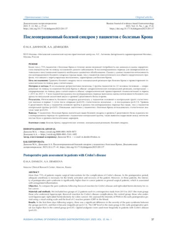 Выводы. У пациентов с болезнью Крона значительно выше болевой синдром и уровень C-реактивного белка в раннем послеоперационном периоде по сравнению с пациентами контрольной группы, также выявлена корреляция между интенсивностью боли и уровнем воспалительных маркеров.