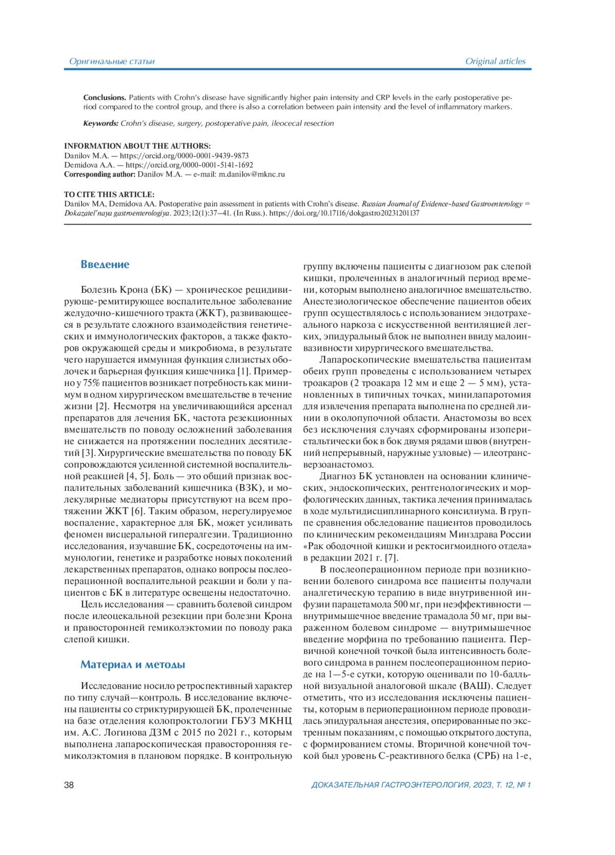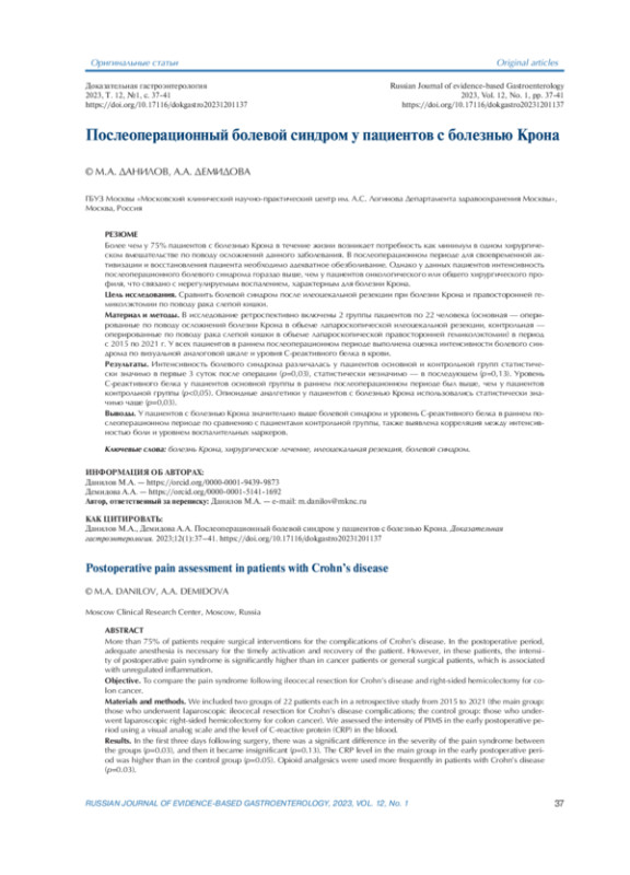 Болезнь Крона (БК) — хроническое рецидивирующе-ремитирующее воспалительное заболевание желудочно-кишечного тракта (ЖКТ), развивающееся в результате сложного взаимодействия генетических и иммунологических факторов, а также факторов окружающей среды и микробиома, в результате чего нарушается иммунная функция слизистых оболочек и барьерная функция кишечника [1]. Примерно у 75% пациентов возникает потребность как минимум в одном хирургическом вмешательстве в течение жизни [2]. Несмотря на увеличивающийся арсенал препаратов для лечения БК, частота резекционных вмешательств по поводу осложнений заболевания не снижается на протяжении последних десятилетий [3]. Хирургические вмешательства по поводу БК сопровождаются усиленной системной воспалительной реакцией [4, 5]. Боль — это общий признак воспалительных заболеваний кишечника (ВЗК), и молекулярные медиаторы присутствуют на всем протяжении ЖКТ [6]. Таким образом, нерегулируемое воспаление, характерное для БК, может усиливать феномен висцеральной гипералгезии. Традиционно исследования, изучавшие БК, сосредоточены на иммунологии, генетике и разработке новых поколений лекарственных препаратов, однако вопросы послеоперационной воспалительной реакции и боли у пациентов с БК в литературе освещены недостаточно.