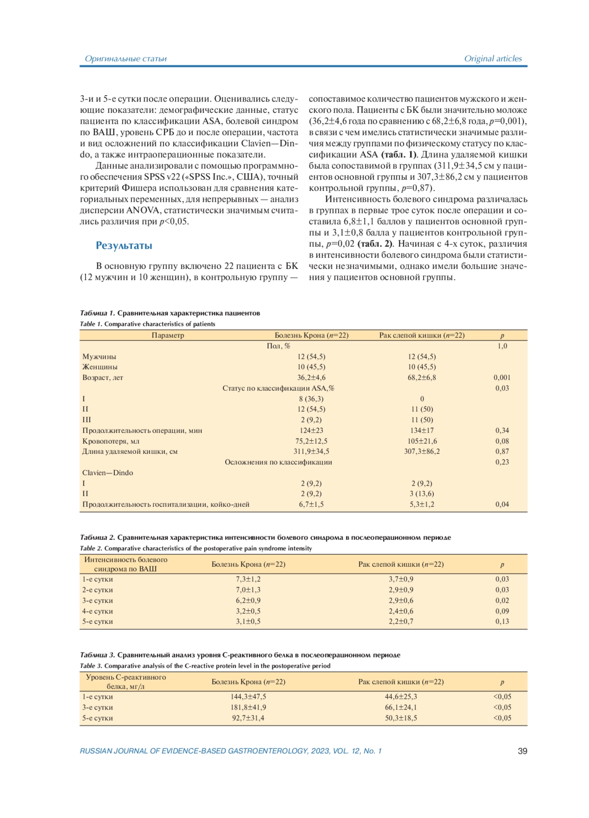 Материал и методы. В исследование ретроспективно включены 2 группы пациентов по 22 человека (основная — оперированные по поводу осложнений болезни Крона в объеме лапароскопической илеоцекальной резекции, контрольная — оперированные по поводу рака слепой кишки в объеме лапароскопической правосторонней гемиколэктомии) в период с 2015 по 2021 г. У всех пациентов в раннем послеоперационном периоде выполнена оценка интенсивности болевого синдрома по визуальной аналоговой шкале и уровня C-реактивного белка в крови.
