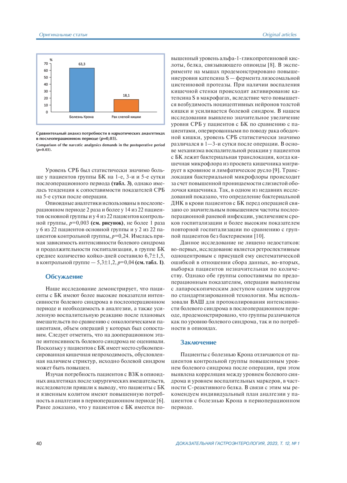 Результаты. Интенсивность болевого синдрома различалась у пациентов основной и контрольной групп статистически значимо в первые 3 суток после операции (p=0,03), статистически незначимо — в последующем (p=0,13). Уровень C-реактивного белка у пациентов основной группы в раннем послеоперационном периоде был выше, чем у пациентов контрольной группы (p<0,05). Опиоидные аналгетики у пациентов с болезнью Крона использовались статистически значимо чаще (p=0,03).