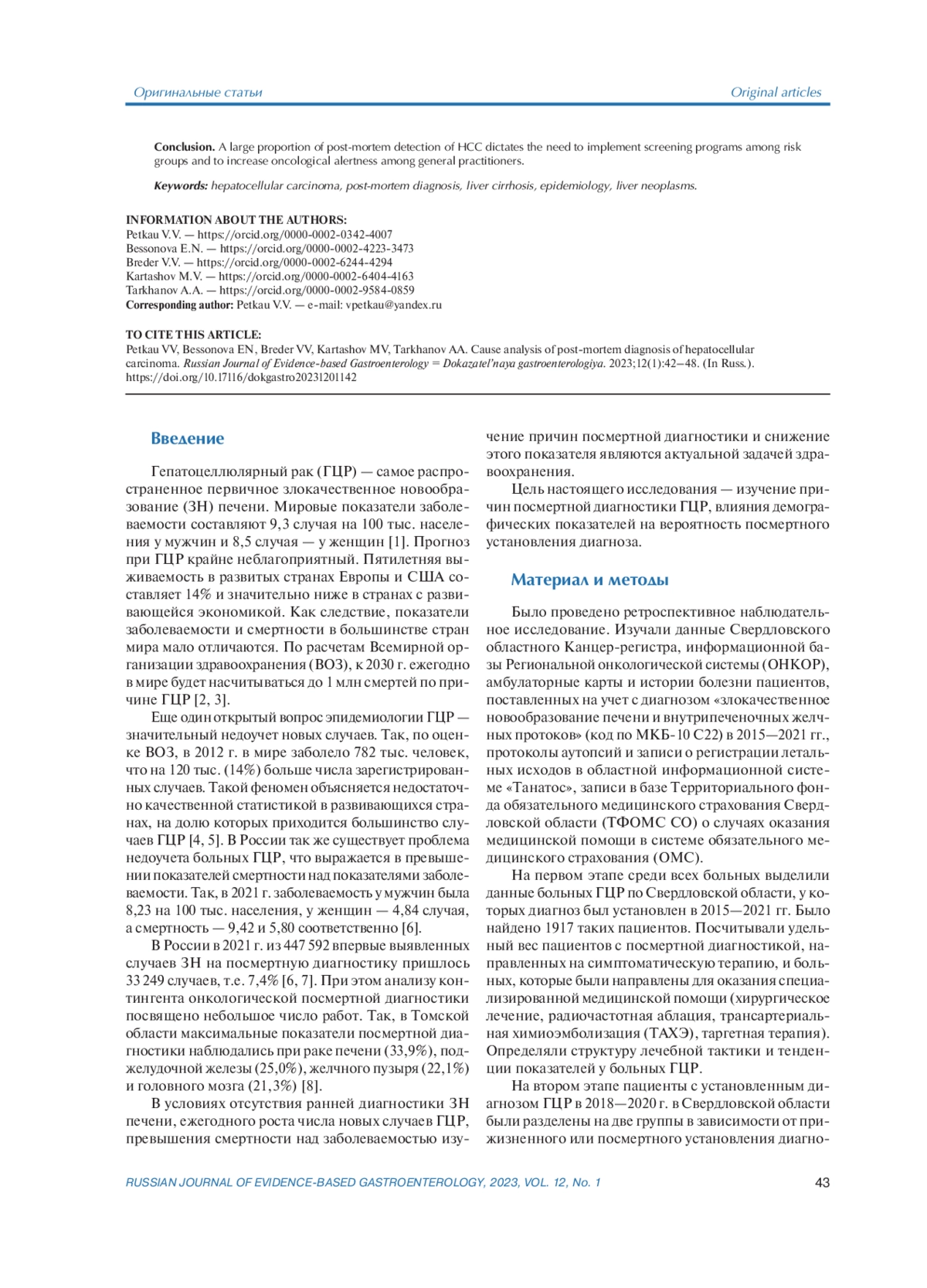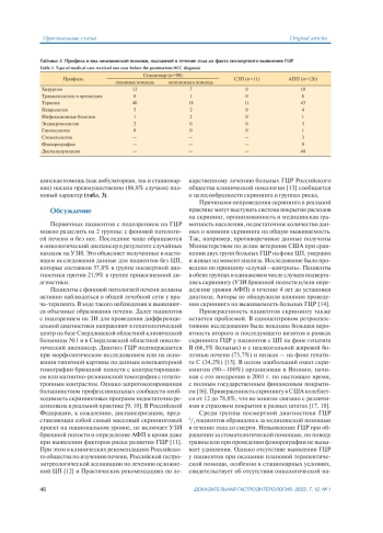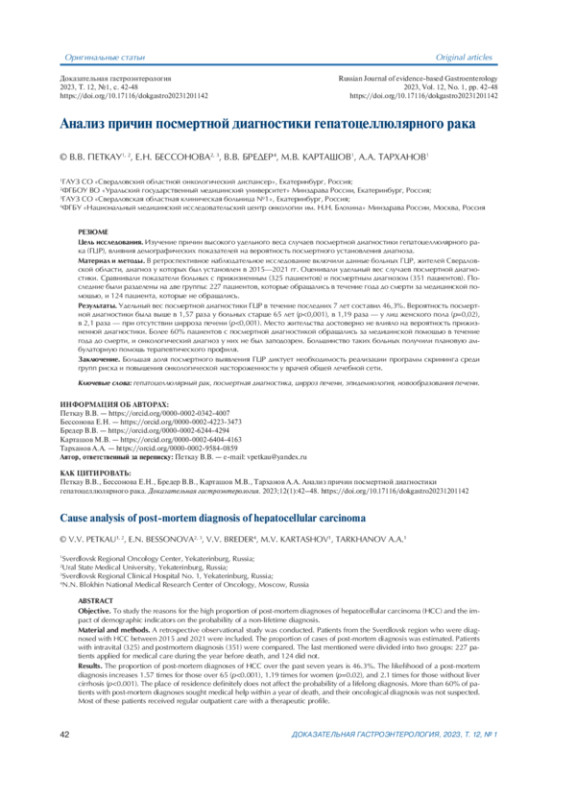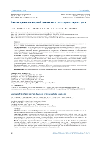 Заключение. Большая доля посмертного выявления ГЦР диктует необходимость реализации программ скрининга среди групп риска и повышения онкологической настороженности у врачей общей лечебной сети.
