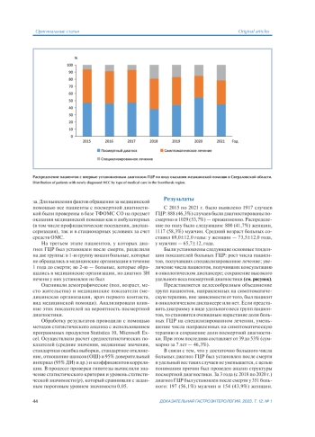 Материал и методы. В ретроспективное наблюдательное исследование включили данные больных ГЦР, жителей Свердловской области, диагноз у которых был установлен в 2015—2021 гг. Оценивали удельный вес случаев посмертной диагностики. Сравнивали показатели больных с прижизненным (325 пациентов) и посмертным диагнозом (351 пациентов). Последние были разделены на две группы: 227 пациентов, которые обращались в течение года до смерти за медицинской помощью, и 124 пациента, которые не обращались.