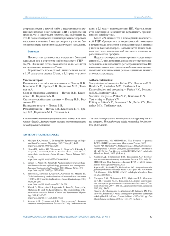 6. Каприн А.Д., Старинский В.В., Шахзадова А.О. Злокачественные новообразования в России в 2021 году (заболеваемость и смертность). М.: МНИОИ им. П.А. Герцена - филиал ФГБУ “НМИЦ радиологии” Минздрава России; 2022.
