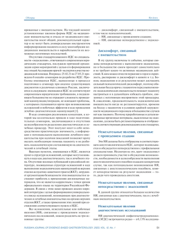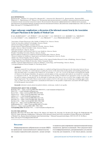 Информированное добровольное согласие (ИДС) на проведение эндоскопического вмешательства — это медико-юридический документ, целью которого является урегулирование взаимоотношений между пациентом, врачом и клиникой. Этот документ является информационным, раскрывающим суть вмешательства для пациента, в том числе риски, ассоциированные с вмешательством. Наличие и детализация рисков, связанных с оказанием медицинской помощи, должны быть обязательной составляющей ИДС, о чем говорит Федеральный закон от 21.11.11 №323-ФЗ «Об основах охраны здоровья граждан в Российской Федерации». Отсутствие стандартизованного ИДС по специальности «эндоскопия», отвечающего современным юридическим стандартам, послужило причиной организации серии мероприятий с целью его формирования под эгидой Ассоциации врачей-экспертов качества медицинской помощи. Результатом этого мероприятия явилось создание ИДС по основным направлениям эндоскопии, в том числе по верхним отделам желудочно-кишечного тракта, в котором одной из составляющих является стандартизованная информация о структуре возможных осложнений, связанных как с диагностическим, так и с лечебным вмешательством.