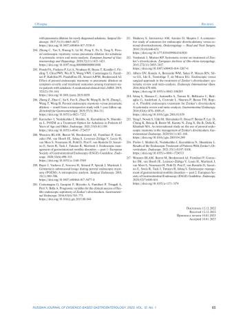 216. Pavlov I, Shishin K, Nedoluzhko I, Kurushkina N, Shumkina L. Results of the Endoscopic Treatment of Patients With Zenker’s Diverticulum. Endoscopy. 2021;53(1):S107-S108. DOI: 10.1055/s-0041-1724533