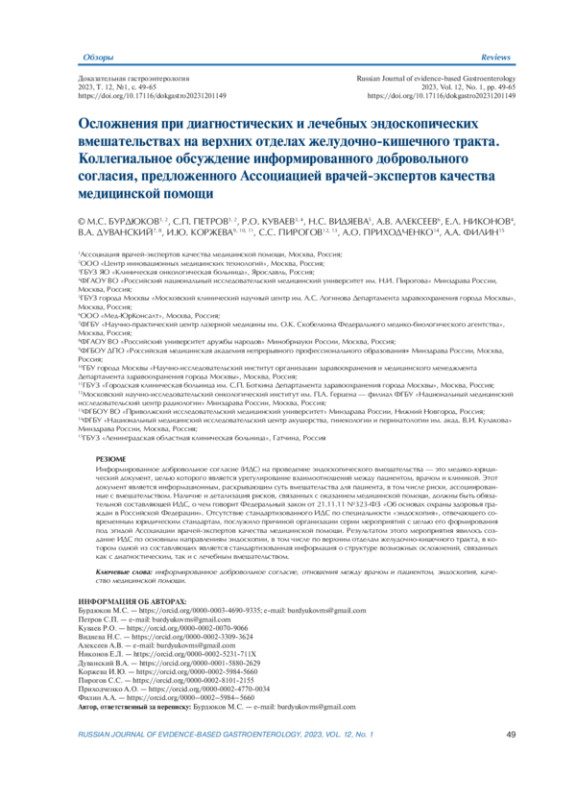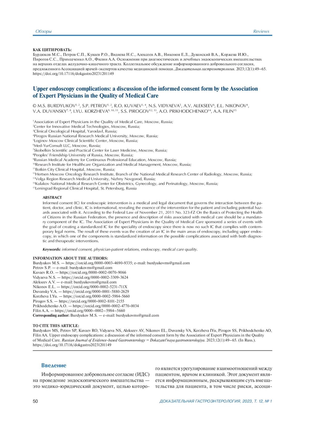 Burdyukov MS, Vatolin VM, Petrov SP, Gusev DV, Kashin SV, Korolev VN, Kuzin MN, Makarov SN, Neustroev VG, Nikonov EL, Prikhodchenko AO, Rosanova TA, Dmitrienko GP. Key results of the seminar “Informed consent in endoscopy” organized by experts association in quality assessment in medical care. Dokazatel’naya gastroenterologiya. 2020;9(4):102-110. (In Russ.). DOI: 10.17116/dokgastro20209041102