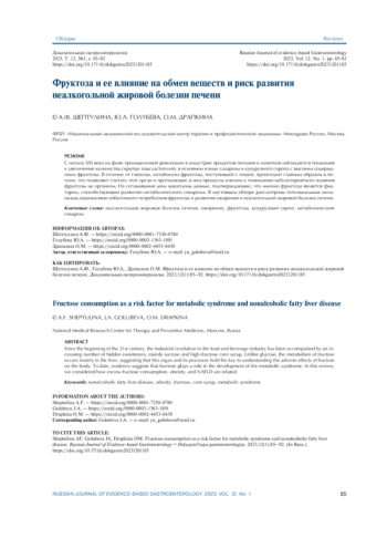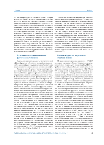 С начала XXI века на фоне промышленной революции в индустрии продуктов питания и напитков наблюдается тенденция к увеличению количества скрытых подсластителей, в основном в виде сахарозы и кукурузного сиропа с высоким содержанием фруктозы. В отличие от глюкозы, метаболизм фруктозы, поступившей с пищей, происходит главным образом в печени, что позволяет считать этот орган и протекающие в нем процессы ключом к пониманию неблагоприятного влияния фруктозы на организм. На сегодняшний день накоплены данные, подтверждающие, что именно фруктоза является фактором, способствующим развитию метаболического синдрома. В настоящем обзоре рассмотрены потенциальные механизмы взаимосвязи избыточного потребления фруктозы и развития ожирения и неалкогольной жировой болезни печени.