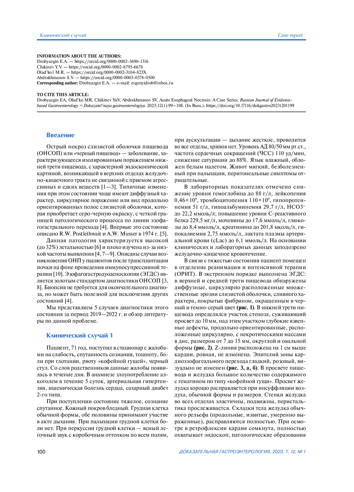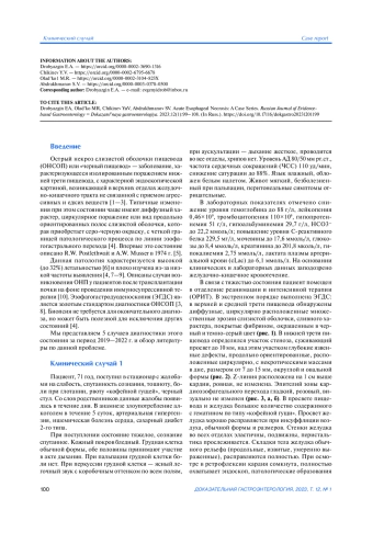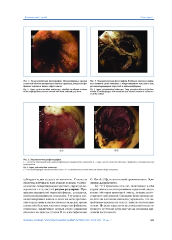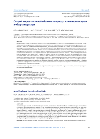 Острый некроз слизистой оболочки пищевода или «черный пищевод» — редкое, остро возникающее заболевание, характеризующееся изолированным поражением слизистой оболочки пищевода, клиническими признаками кровотечения в сочетании с тяжелыми метаболическими нарушениями. Диагноз можно установить по данным эндоскопического обследования верхних отделов желудочно-кишечного тракта. В данной статье представлены случаи эндоскопической диагностики данного заболевания у 5 пациентов, которые госпитализированы в клинику с диагнозом желудочно-кишечного кровотечения. При эндоскопическом исследовании выявлен острый некроз слизистой оболочки пищевода, отмечено отсутствие изменений в зоне пищеводно-желудочного перехода. Эрозивно-язвенные изменения желудка и двенадцатиперстной кишки диагностированы у всех пациентов. У 4 пациентов имелась тяжелая сопутствующая патология (артериальная гипертензия, сахарный диабет, ишемическая болезнь сердца). В 80% случаев имело место злоупотребление алкоголем. Во всех случаях пациентам проводилось лечение как основного синдрома (с применением высоких доз ингибиторов протонной помпы), так и сопутствующей патологии. Хороший эффект получен в трех случаях. Двое пациентов скончались на фоне прогрессирования полиорганной недостаточности. Вероятность острого некроза слизистой оболочки пищевода следует учитывать в процессе дифференциальной диагностике при наличии симптомов одинофагии и желудочно-кишечного кровотечения у пациентов, поступающих в стационар.
