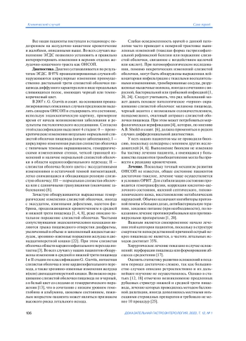 Острый некроз слизистой оболочки пищевода (ОНСОП) или «черный пищевод» — заболевание, характеризующееся изолированным поражением нижней трети пищевода, с характерной эндоскопической картиной, возникающей в верхних отделах желудочно-кишечного тракта не связанной с приемом агрессивных и едких веществ [1—3]. Типичные изменения при этом состоянии чаще имеют диффузный характер, циркулярное поражение или вид продольно ориентированных полос слизистой оболочки, которая приобретает серо-черную окраску, с четкой границей патологического процесса по линии эзофагогастрального перехода [4]. Впервые это состояние описано R. W. Postlethwait и A. W. Musser в 1974 г. [5].