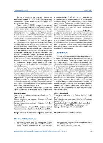 Заключение. Основные положения Чикагской классификации нарушений моторики пищевода 4-го пересмотра в целом подтвердили предыдущую версию данного документа. Изменения, внесенные советом экспертов в обновленную версию Чикагской классификации, касались расширенного применения провокационных тестов для обеспечения более точной диагностики заболеваний, сопровождающихся обструкцией нижнего пищеводного сфинктера. Введены новые диагностические критерии для стандартизированной диагностики нарушений моторики пищевода.