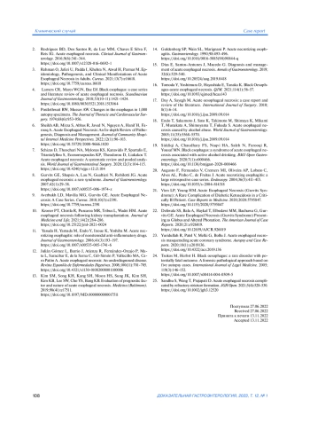 6. Sheikh AB, Mirza S, Abbas R, Javed N, Nguyen A, Hanif H, Farooq A. Acute Esophageal Necrosis: An In-depth Review of Pathogenesis, Diagnosis and Management. Journal of Community Hospital Internal Medicine Perspectives. 2022;12(1):96-103. DOI: 10.55729/2000-9666.1020