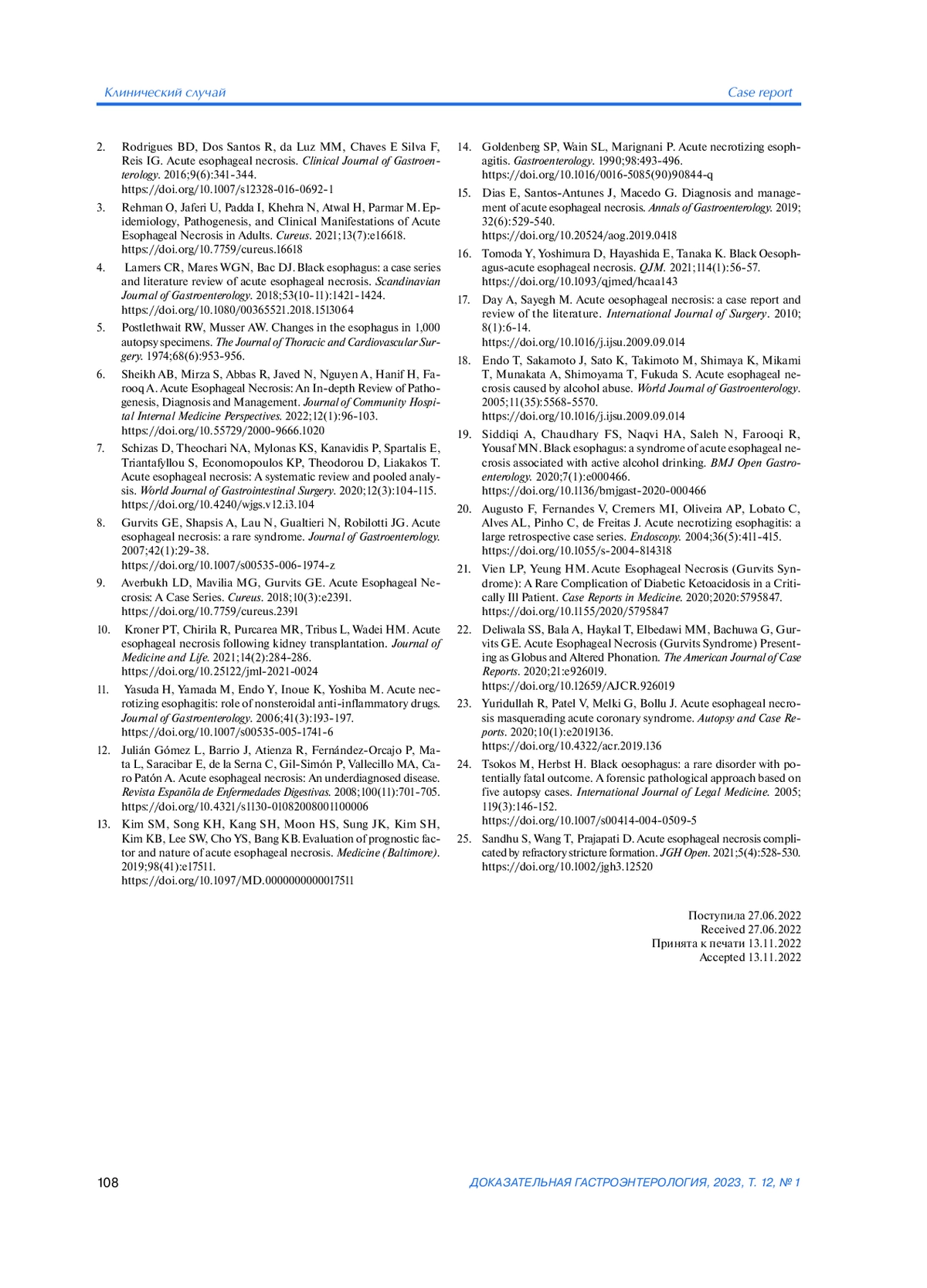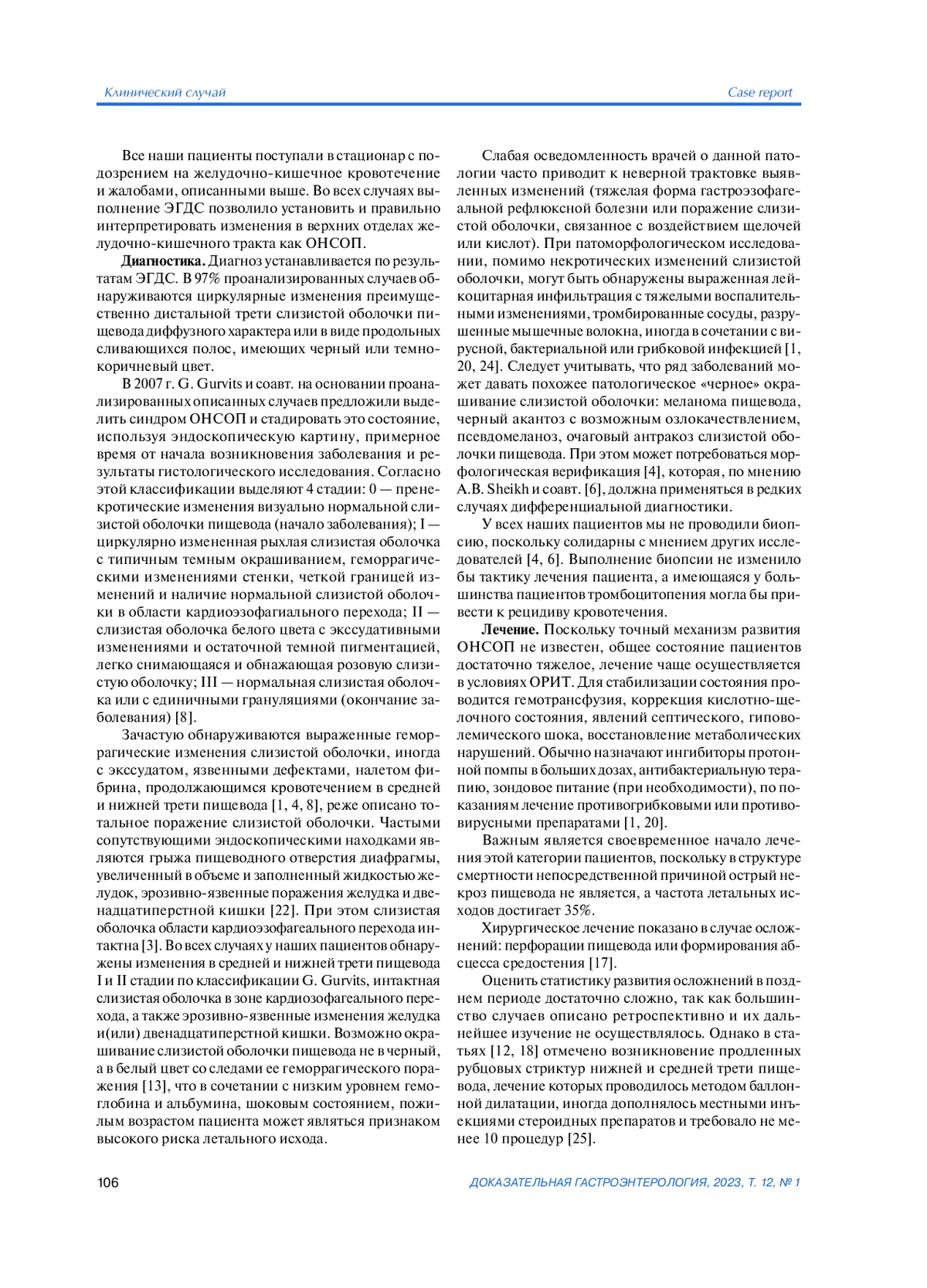 22. Deliwala SS, Bala A, Haykal T, Elbedawi MM, Bachuwa G, Gurvits GE. Acute Esophageal Necrosis (Gurvits Syndrome) Presenting as Globus and Altered Phonation. The American Journal of Case Reports. 2020;21:e926019. DOI: 10.12659/AJCR.926019 geal necrosis masquerading acute coronary syndrome. Autopsy and Case Reports. 2020;10(1):e2019136. DOI: 10.4322/acr.2019.136