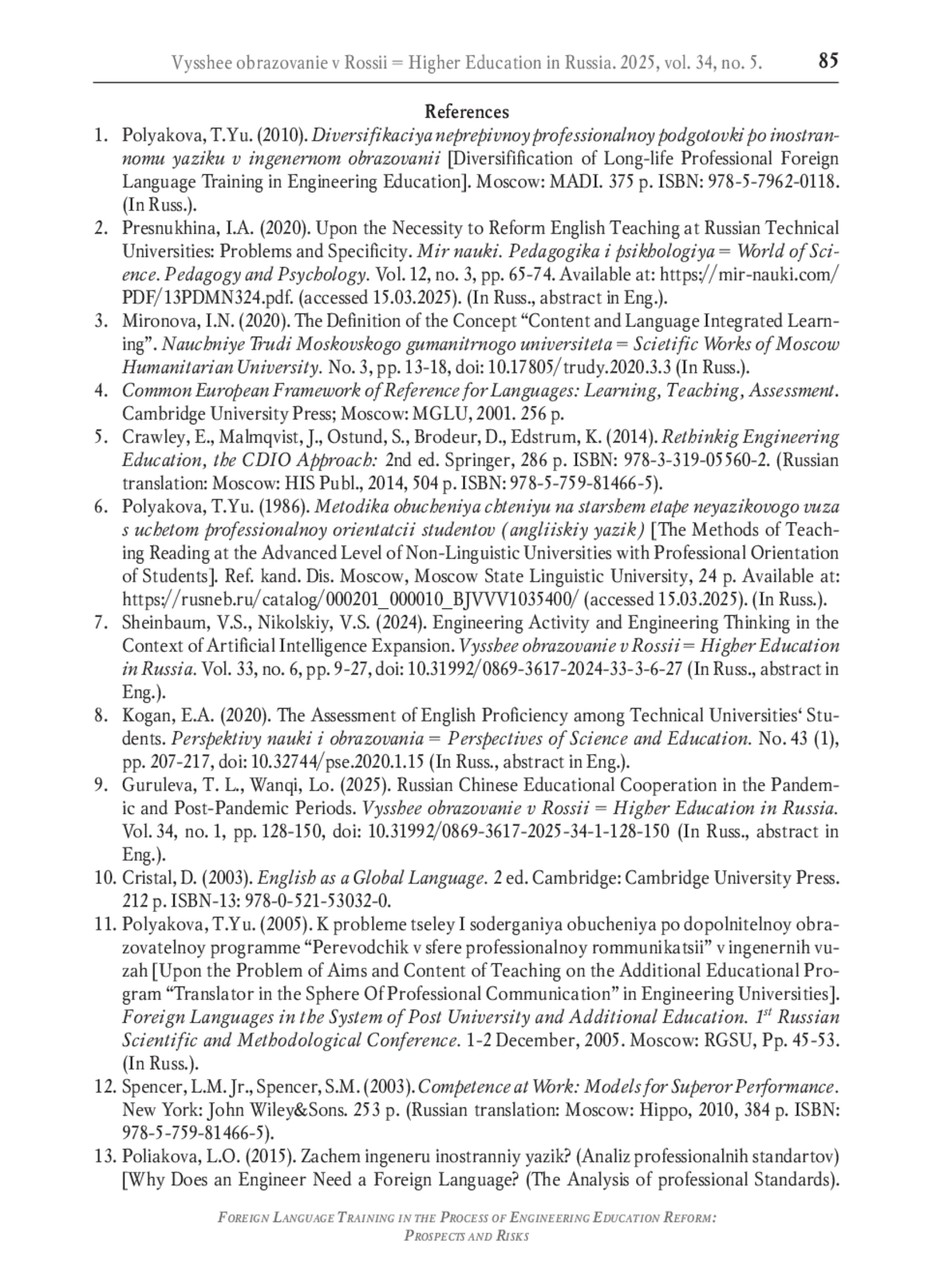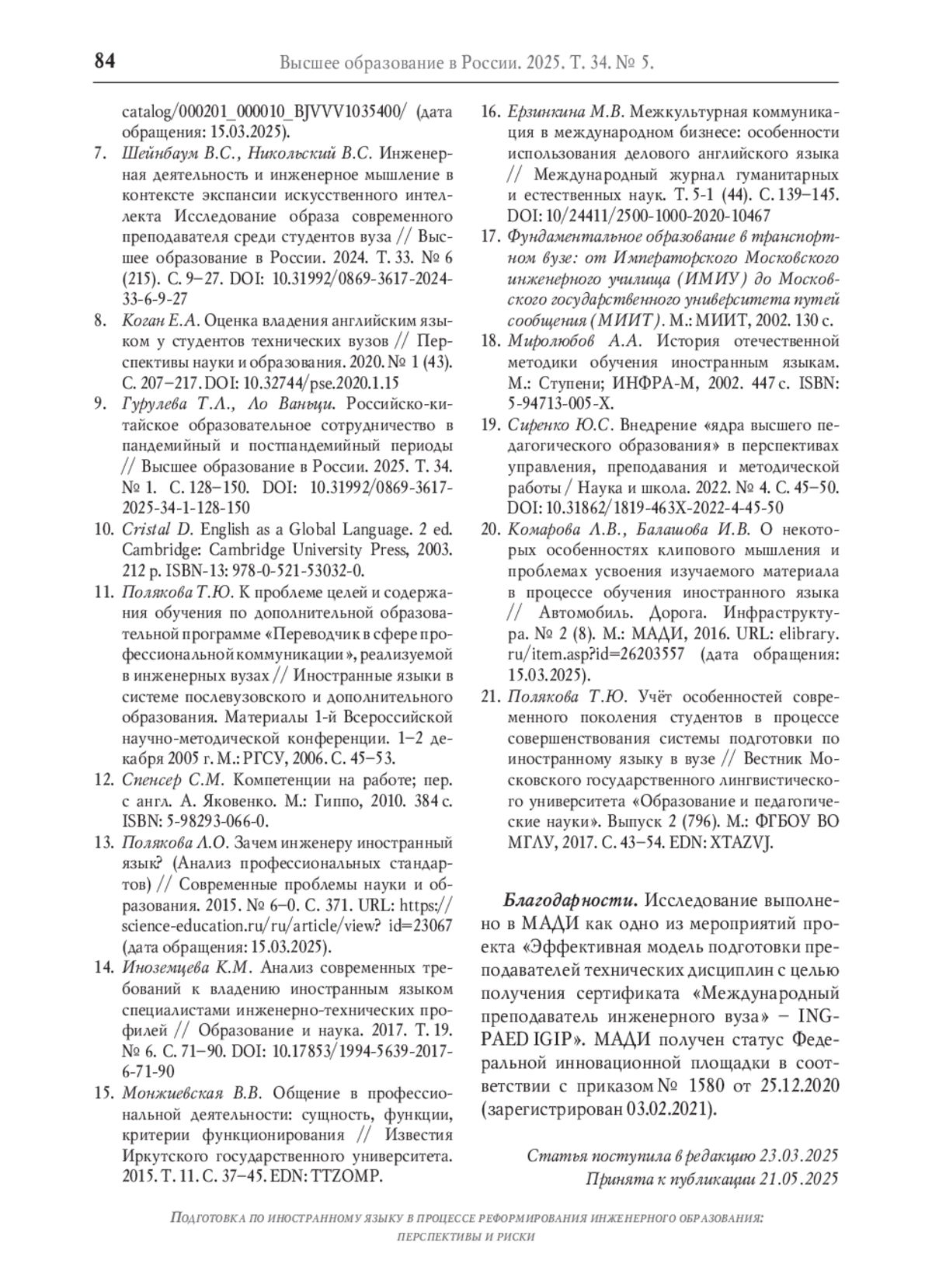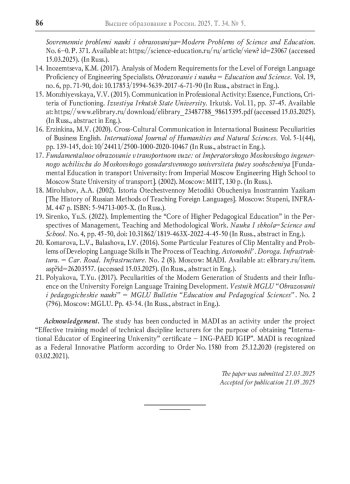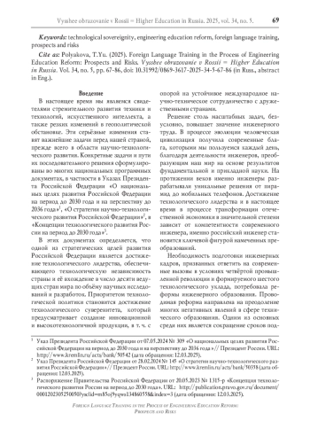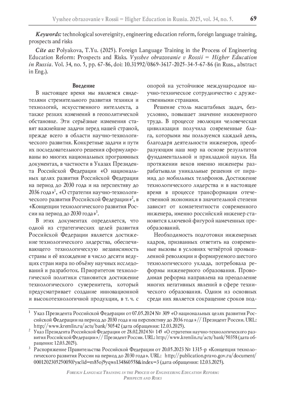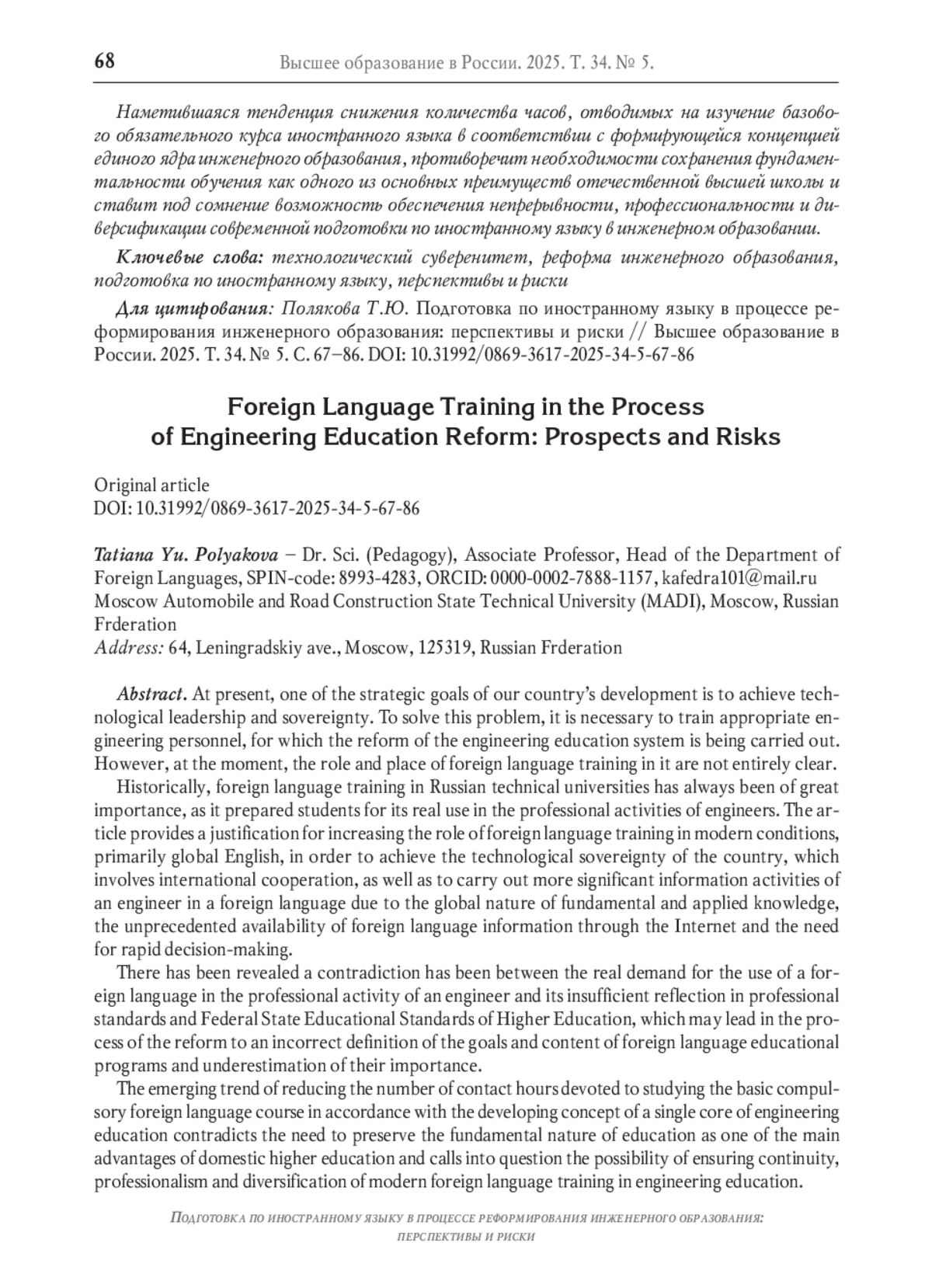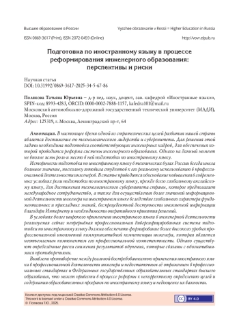 В настоящее время одной из стратегических целей развития нашей страны является достижение ею технологического лидерства и суверенитета. Для решения этой задачи необходима подготовка соответствующих инженерных кадров, для обеспечения которой проводится реформа системы инженерного образования. Однако на данный момент не вполне ясны роль и место в ней подготовки по иностранному языку. Исторически подготовка по иностранному языку в технических вузах России всегда имела большое значение, поскольку готовила студентов к его реальному использованию в профессиональной деятельности инженеров. В статье приводится обоснование повышения в современных условиях роли подготовки по иностранному языку, прежде всего глобальному английскому языку, для достижения технологического суверенитета страны, которое предполагает международное сотрудничество, а также для осуществления более значимой информационной деятельности инженера на иностранном языке вследствие глобального характера фундаментальных и прикладных знаний, беспрецедентной доступности иноязычной информации благодаря Интернету и необходимости оперативного принятия решений. В условиях более широкого применения иностранного языка в инженерной деятельности реализуемая сейчас непрерывная профессиональная диверсифицированная система подготовки по иностранному языку должна обеспечить формирование более высокого уровня профессиональной иноязычной коммуникативной компетенции инженера, которая является неотъемлемым компонентом его профессиональной компетентности. Однако существуют определённые риски снижения результатов обучения, которые связаны с обозначившимися противоречиями. Выявлено противоречие между реальной востребованностью применения иностранного языка в профессиональной деятельности инженера и недостаточным её отражением в профессиональных стандартах и Федеральных государственных образовательных стандартах высшего образования, что может привести в процессе реформы к некорректному определению целей и содержания образовательных программ по иностранному языку и недооценке их важности. Наметившаяся тенденция снижения количества часов, отводимых на изучение базового обязательного курса иностранного языка в соответствии с формирующейся концепцией единого ядра инженерного образования, противоречит необходимости сохранения фундаментальности обучения как одного из основных преимуществ отечественной высшей школы и ставит под сомнение возможность обеспечения непрерывности, профессиональности и диверсификации современной подготовки по иностранному языку в инженерном образовании.