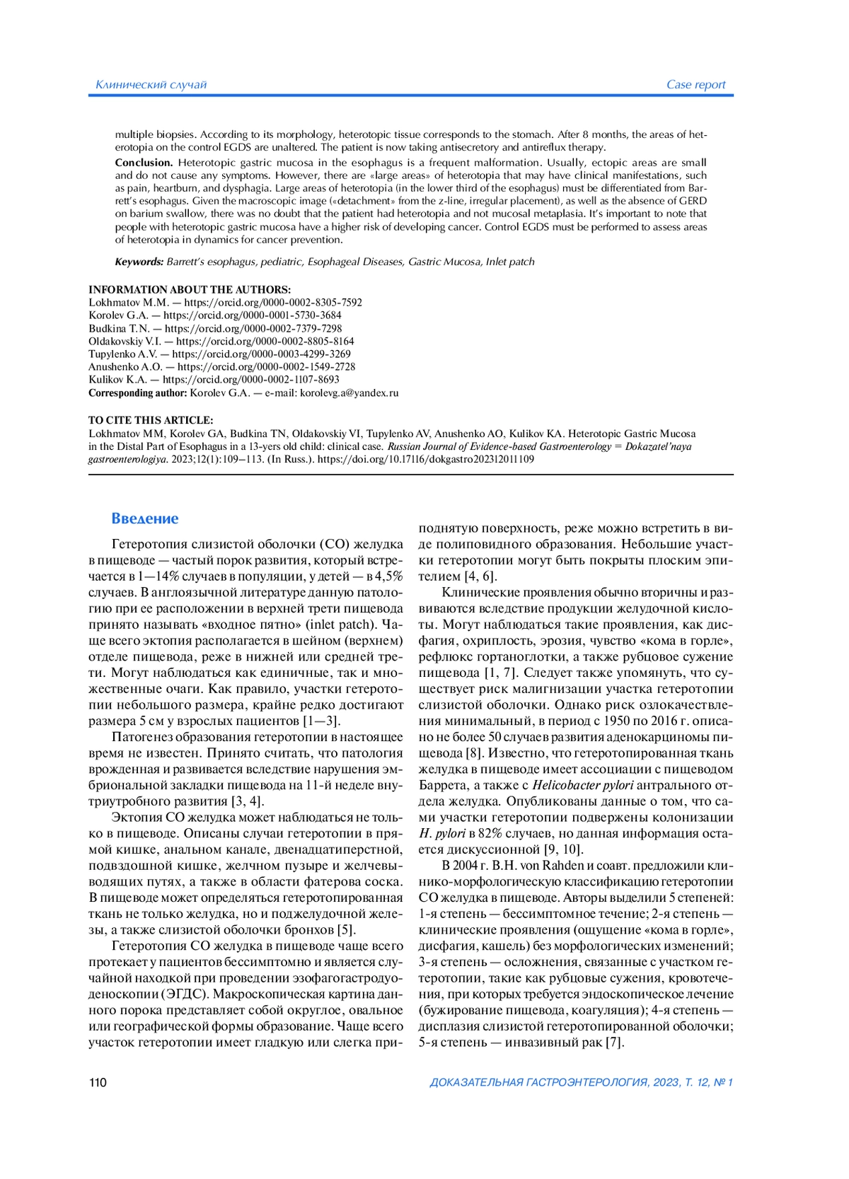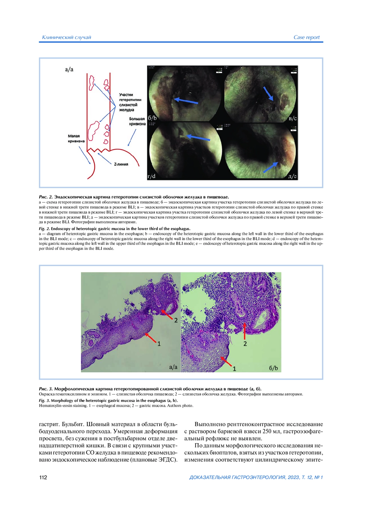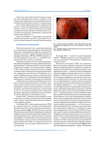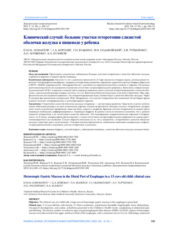 Клиническое наблюдение. Мальчик 13 лет с диагнозом трисомия по 21 паре хромосом (синдром Дауна, аутоиммунный тиреоидит (гипертрофическая форма), задержка психоречевого развития, нарушение сердечного ритма) впервые обратился в ФГАУ «НМИЦ здоровья детей» Минздрава России с жалобами на периодическую боль в животе и отрыжку. По данным рентгеноконтрастного исследования установлено отсутствие гастроэзофагеального рефлюкса. Выполнена эзофагогастродуоденоскопия (ЭГДС): в верхней и нижней трети пищевода выявлено много участков гетеротопированной слизистой оболочки, максимальный размер которых достигал 3×2 см. Выполнена биопсия нескольких участков гетеротопии. При морфологическом исследовании выявлено, что гетеротопированная ткань соответствует слизистой оболочке желудка. Через 8 месяцев при выполнении контрольной ЭГДС обнаружено, что участки гетеротопии без изменений. В настоящее время пациент получает антирефлюксную и антисекреторную терапию.