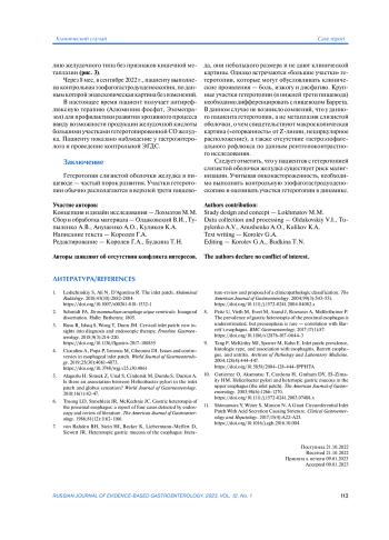 Заключение. Гетеротопия слизистой оболочки желудка в пищеводе — частый порок развития. Чаще всего участки эктопии имеют небольшой размер и не дают клинической картины. Однако встречаются «большие участки» гетеротопии, которые могут иметь клинические проявления, такие как боль, изжога и дисфагия. Крупные участки гетеротопии (в нижней трети пищевода) необходимо дифференцировать с пищеводом Баррета. В данном случае не возникло сомнений, что у данного пациента гетеротопия, а не метаплазия слизистой оболочки. Это подтверждено макроскопической картиной («оторванность» от Z-линии, нециркулярное расположение), а также отсутствием гастроэзофагеального рефлюкса по данным рентгеноконтрастного исследования. Следует обратить внимание на то, что у пациентов с гетеротопией слизистой оболочки желудка существует риск малигнизации. Учитывая онконастороженность, необходимо выполнять контрольную эзофагогастродуоденоскопию и оценивать участки гетеротопии в динамике.
