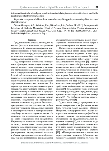 Под намерениями понимается совокупность факторов, отражающих количество усилий, которое готов приложить индивид для реализации поведения [2], в данном случае – предпринимательской деятельности. В своей работе авторы настоящей статьи обращаются к предпринимательским намерениям студентов. Важность их исследования обусловлена несколькими причинами. Во-первых, при наличии стремления со стороны государства стимулировать переход к предпринимательству и инвестиций в предпринимательское образование, важно понимать механизмы, при помощи которых можно оказывать воздействие на предпринимательские намерения студентов.