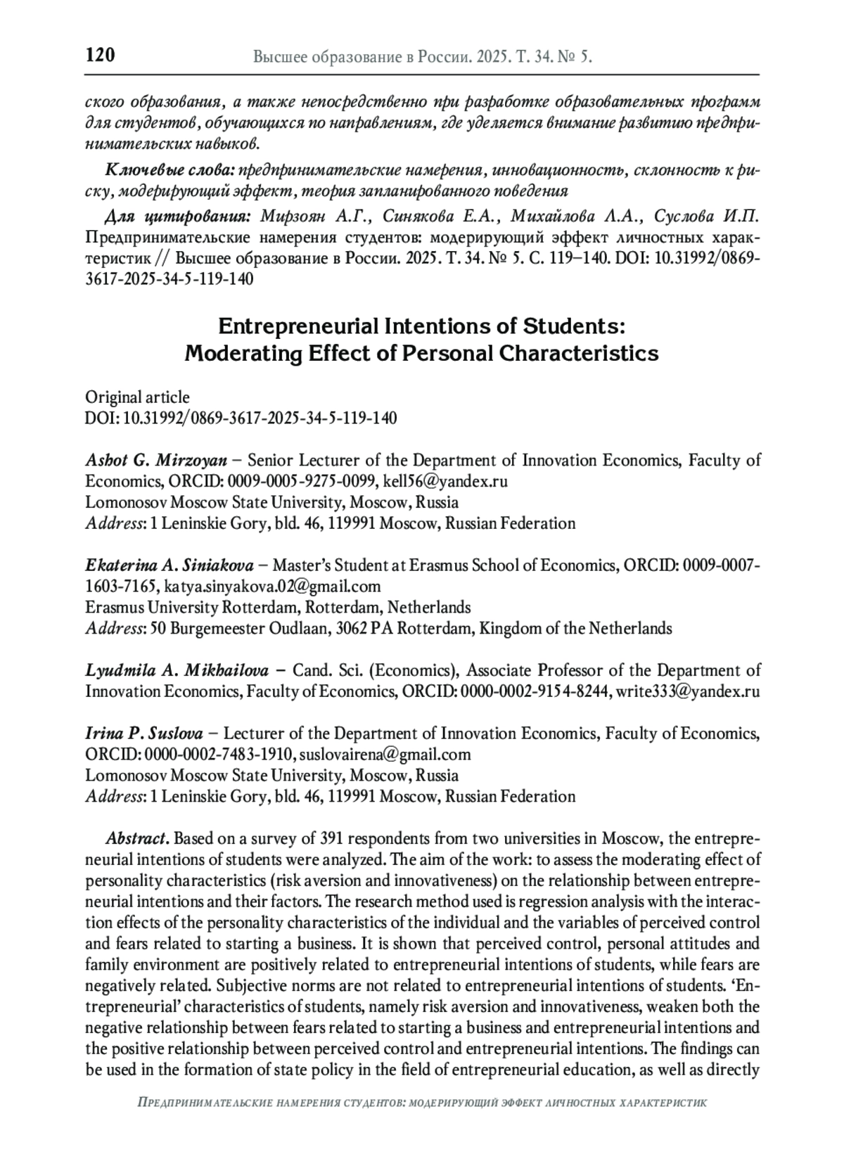 На основе опроса 391 респондента из двух московских университетов проведён анализ предпринимательских намерений студентов. Цель работы: оценить модерирующий эффект личностных характеристик (склонности к риску и инновационности) на связь между предпринимательскими намерениями и их факторами. В качестве метода исследования используется регрессионный анализ с добавлением произведений переменных, отвечающих за личностные характеристики индивида, с переменными воспринимаемого контроля и страхов, связанных с открытием бизнеса (interaction effects). Выявлено, что воспринимаемый контроль, личностные установки и семейное окружение положительно связаны с предпринимательскими намерениями студентов, а страхи - отрицательно. Субъективные нормы не связаны с предпринимательскими намерениями студентов. «Предпринимательские» характеристики студентов, а именно склонность к риску и инновационность, ослабляют как негативную связь страхов, связанных с открытием бизнеса, с предпринимательскими намерениями, так и положительную связь между воспринимаемым контролем и предпринимательскими намерениями. Полученные результаты могут быть использованы при формировании государственной политики в области предпринимательского образования, а также непосредственно при разработке образовательных программ для студентов, обучающихся по направлениям, где уделяется внимание развитию предпринимательских навыков.