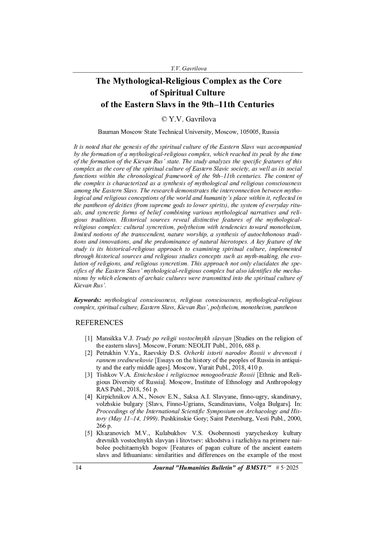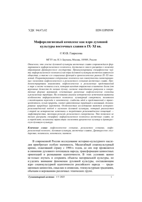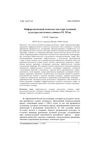 Отмечено, что генезис духовной культуры восточных славян сопровождался формированием мифорелигиозного комплекса, достигшего своего расцвета к моменту образования Древнерусского государства. Проанализированы специфические черты мифорелигиозного комплекса как ядра духовной культуры восточнославянского общества, а также его социальных функций в хронологических рамках IX–XI столетий. Охарактеризовано содержание комплекса как совокупности синтезированных элементов мифологического и религиозного сознания восточных славян. Продемонстрирована взаимосвязь мифологических и религиозных представлений о мире и месте человека в нем, которая находит отражение в пантеоне богов (от верховных божеств до низших духов), системе повседневных ритуалов и синкретичных формах верований, сочетающих различные мифологические сюжеты и религиозные традиции. На основании анализа исторических источников выявлены особенности мифорелигиозного комплекса: культурный синкретизм, политеизм с тенденциями перехода к монотеизму, слабость идей и представлений о трансцендентном, культ природы, синтез автохтонных традиций и инноваций, доминирование природных иеротопов. Особенностью исследования является историкорелигиоведческий подход к изучению духовной культуры, который реализуется с опорой на исторические источники и посредством религиоведческих концепций — мифотворчества, эволюции религий, религиозного синкретизма. Это позволило не только раскрыть специфику мифорелигиозного комплекса восточных славян, но и определить механизмы трансляции элементов архаических культур в древнерусскую духовную культуру.