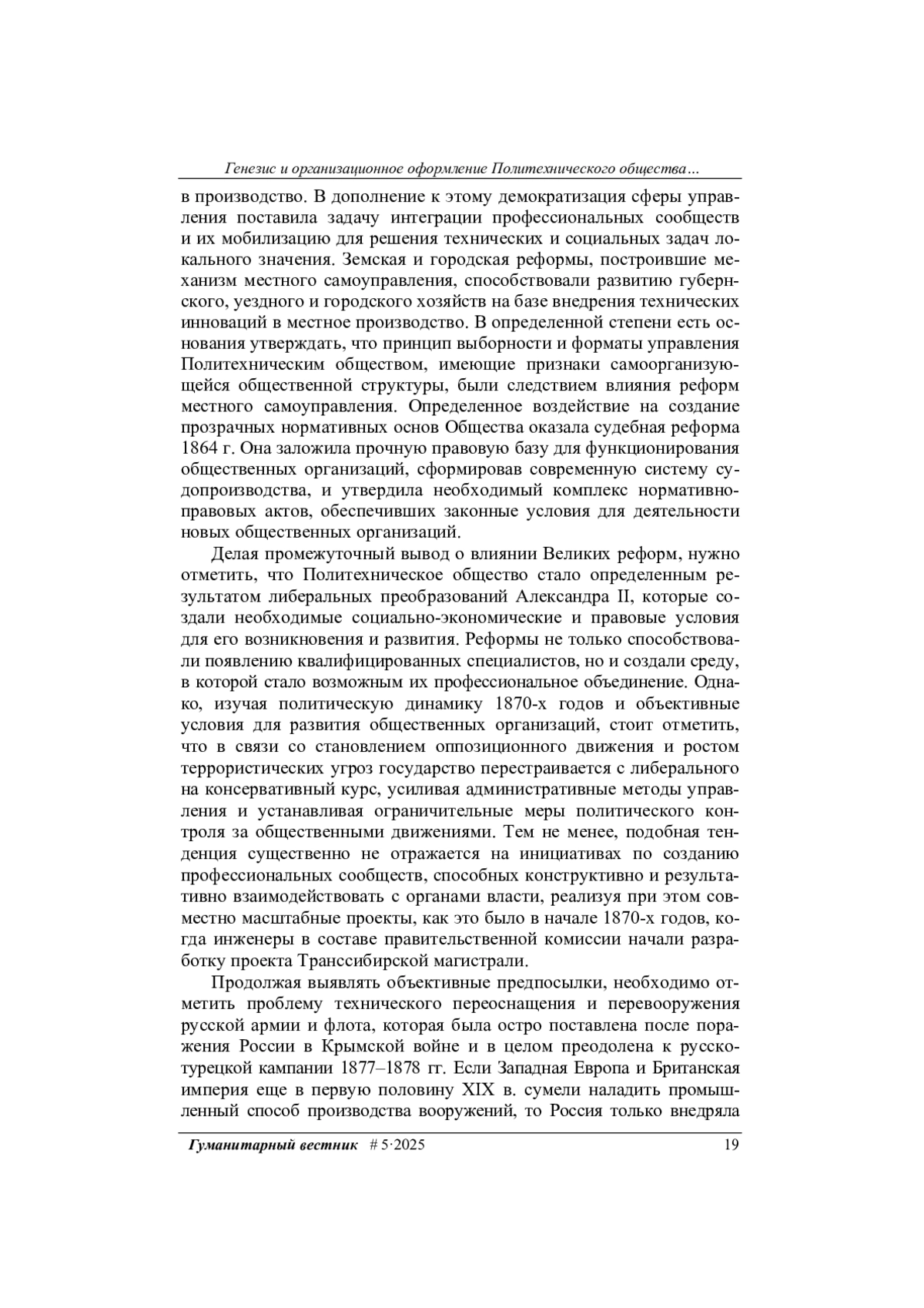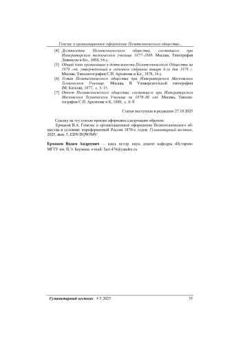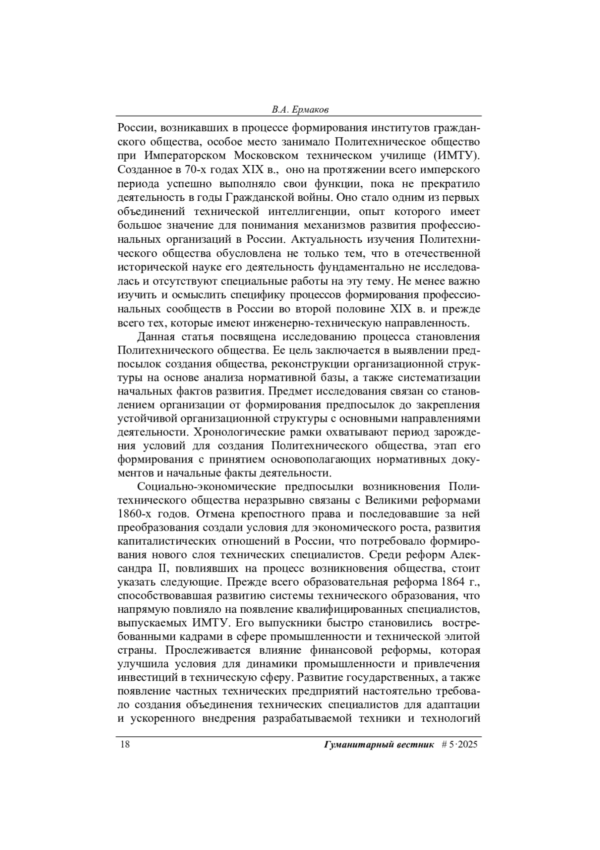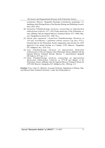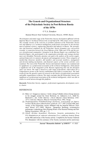 Рассмотрены формирование и начальный этап развития Политехнического общества при Императорском Московском техническом училище во второй половине XIX в. Научная новизна работы состоит в постановке проблемы о роли и влиянии Политехнического общества как профессионального объединения технической интеллигенции на развитие отечественных наук, инженерного образования и промышленности в России. Последовательно выявлены предпосылки и исторические условия создания Политехнического общества. Проведена связь между Великими реформами 1860–1870-х годов и процессом становления профессиональных сообществ в Российской империи. Выявлены ключевые исторические лица, принимавшие участие в разработке принципов и стратегии организации. Особое внимание уделено анализу организационной структуры общества, его уставных документов и системы управления. Исследованы три категории членства (почетные члены, действительные члены и члены-сотрудники), механизмы управления и принятия решений, финансовые аспекты деятельности. Рассмотрен вопрос о международных связях Политехнического общества, и показана его значимость как профессионального объединения технической интеллигенции, сыгравшей существенную роль в интеграции российской инженерной элиты в европейское пространство. Исследование опирается на широкий круг документов, что позволяет представить всестороннюю картину становления Общества и отразить существенные факты. Результаты исследования вписываются в общий контекст исследования истории профессиональных объединений и общественных организаций в России. Сделан вывод о значимости Политехнического общества как профессионального объединения технической интеллигенции, сумевшей посредством данной площадки реализовать свою социальную миссию.