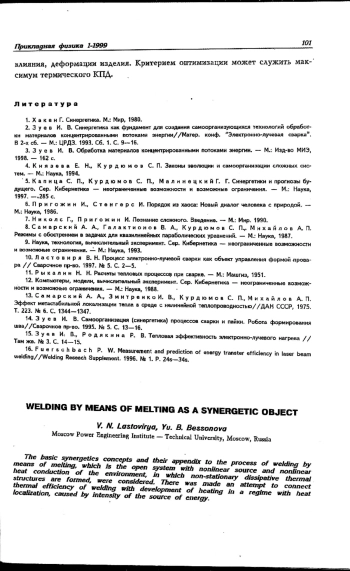 Таким образом, встает задача оптимизации процесса сварки как повышение степени его самоорганизации не только с позиций экономии энергии источника, но и с позиций качества провара, величины зоны термического влияния, деформации изделия. Критерием оптимизации может служить максимум термического КПД.