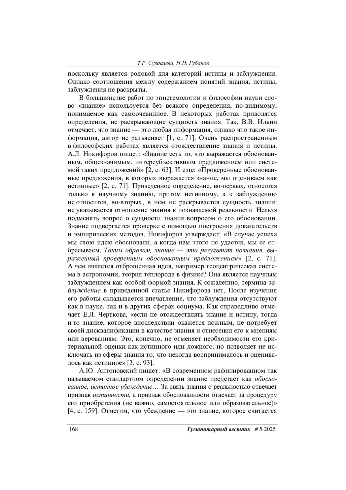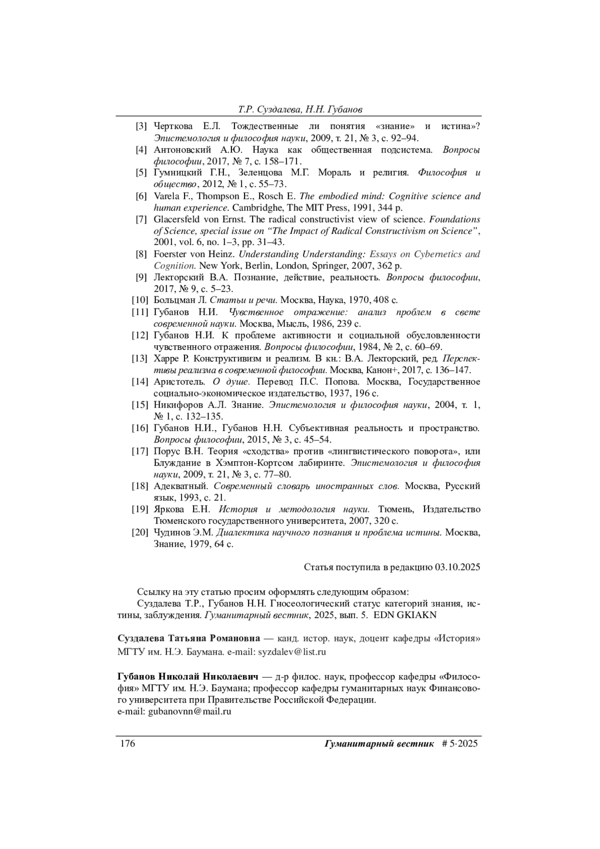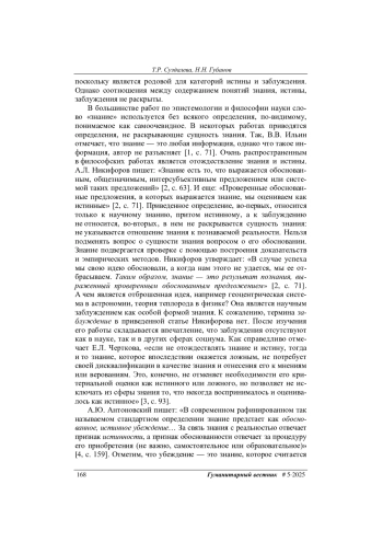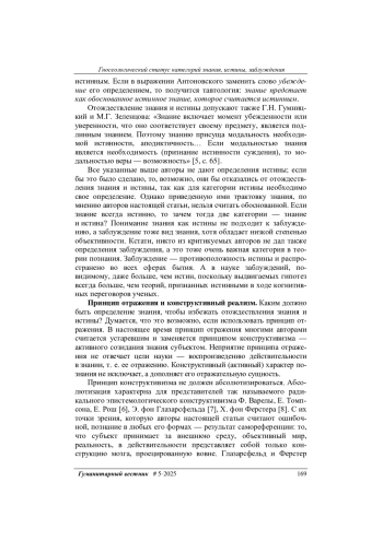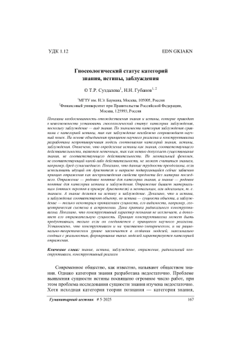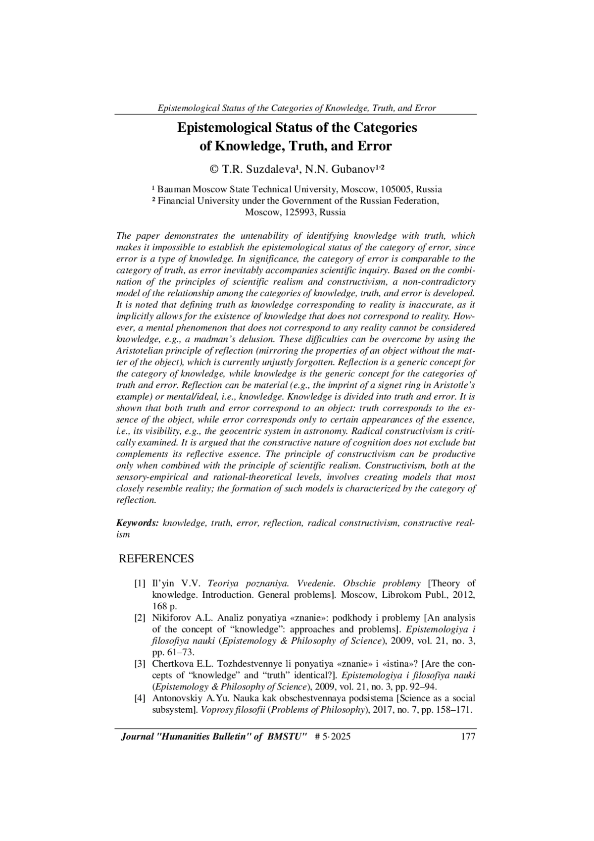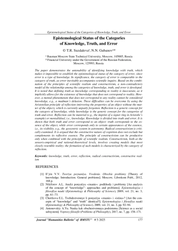 Показана необоснованность отождествления знания и истины, которое приводит к невозможности установить гносеологический статус категории заблуждения, поскольку заблуждение - вид знания. По значимости категория заблуждения сравнима с категорией истины, так как заблуждение неизбежно сопровождает научный поиск. На основе объединения принципов научного реализма и конструктивизма разработана непротиворечивая модель соотношения категорий знания, истины, заблуждения. Отмечено, что определение истины как знания, соответствующего действительности, является неточным, так как неявно допускает существование знания, не соответствующего действительности. Но ментальный феномен, не соответствующий какой-либо действительности, не может считаться знанием, например, бред сумасшедшего. Показано, что данные трудности преодолимы, если использовать идущий от Аристотеля и напрасно подвергающийся сейчас забвению принцип отражения как воспроизведения свойств предмета без материи последнего. Отражение - родовое понятие для категории знания, а знание - родовое понятие для категории истины и заблуждения. Отражение бывает материальным (оттиск перстня в примере Аристотеля) и ментальным, или идеальным, т. е. знанием. А знание делится на истину и заблуждение. Доказано, что и истина, и заблуждение соответствуют объекту, но истина - сущности объекта, а заблуждение - только некоторым проявлениям сущности, его видимости, например, геоцентрическая система в астрономии. Дана критика радикального конструктивизма. Показано, что конструктивный характер познания не исключает, а дополняет его отражательную сущность. Принцип конструктивизма может быть продуктивным, только если он соединяется с принципом научного реализма. Установлено, что конструктивизм и на чувственно-эмпирическом, и на рационально-теоретическом уровне заключается в создании моделей, максимально сходных с реальностью, формирование таких моделей характеризуется категорией отражения.