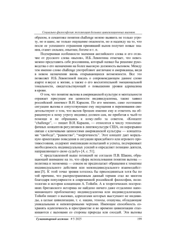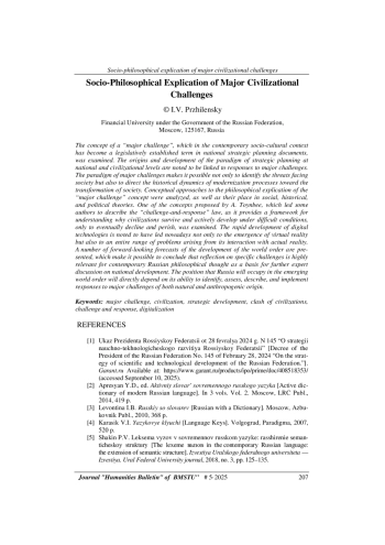 Рассмотрено понятие большого вызова, которое в современном социально-культурном контексте стало термином, получившим законодательное закрепление в документах национального стратегического планирования. Отмечено, что истоки и развитие парадигмы стратегического планирования на национальном и цивилизационном уровнях связаны с ответом на большие вызовы. Парадигма больших вызовов позволяет не только определять стоящие перед социумом угрозы, но и направлять историческую динамику модернизационных процессов на преобразование общества. Проанализированы концептуальные подходы к философской экспликации понятия большого вызова, их место в социальных, исторических и политических концепциях. Исследована одна из предложенных А. Тойнби концепций, позволившая некоторым авторам назвать открытую им зависимость законом вызова и ответа, так как она дает возможность ответить на вопрос, почему цивилизации выживают в трудных условиях и активно развиваются, а затем приходят в упадок и гибнут. Отмечено, что в настоящее время бурное развитие цифровой техники привело к появлению не только виртуальной реальности, но и целого комплекса проблем, возникающих при ее взаимодействии с реальностью действительной. Приведен ряд перспективных прогнозов развития мирового порядка, из которых можно сделать вывод об актуальности для современной российской философской мысли рефлексии конкретных вызовов с целью дальнейшей экспертной дискуссии о национальном развитии. То место, которое Россия займет в формирующемся миропорядке, будет напрямую зависеть от возможности выявить, оценить, описать и реализовать ответные меры на большие вызовы как природного, так и антропогенного характера.