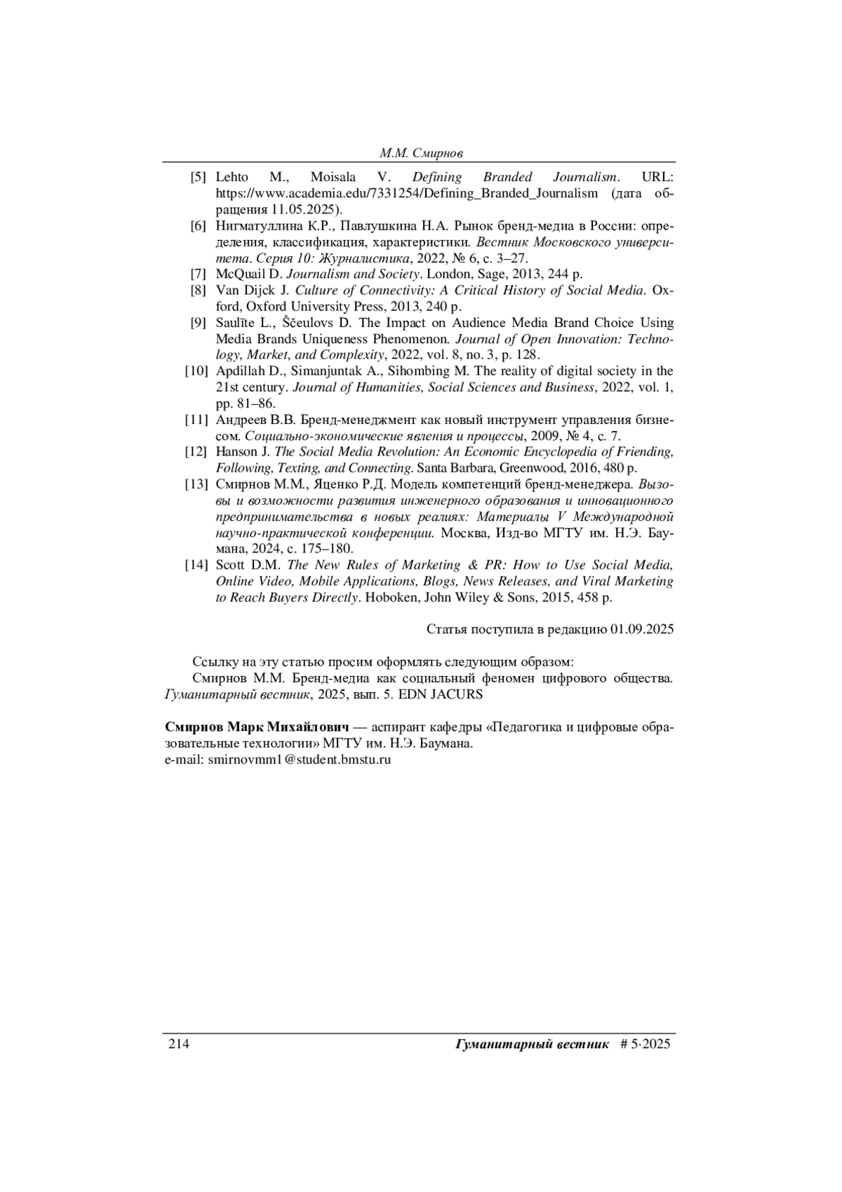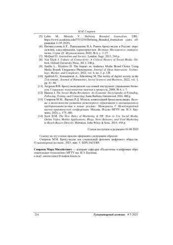 5. Lehto M., Moisala V. Defining Branded Journalism. URL: https://www.academia.edu/7331254/Defining_Branded_Journalism (дата обращения 11.05.2025).