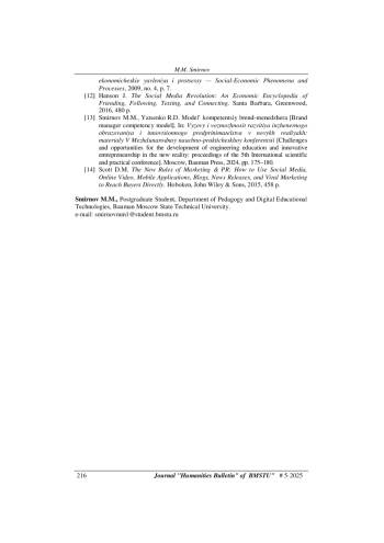 13. Смирнов М.М., Яценко Р.Д. Модель компетенций бренд-менеджера. Вызовы и возможности развития инженерного образования и инновационного предпринимательства в новых реалиях: Материалы V Международной научно-практической конференции. Москва, Изд-во МГТУ им. Н.Э. Баумана, 2024, с. 175-180. EDN: DKRZAI