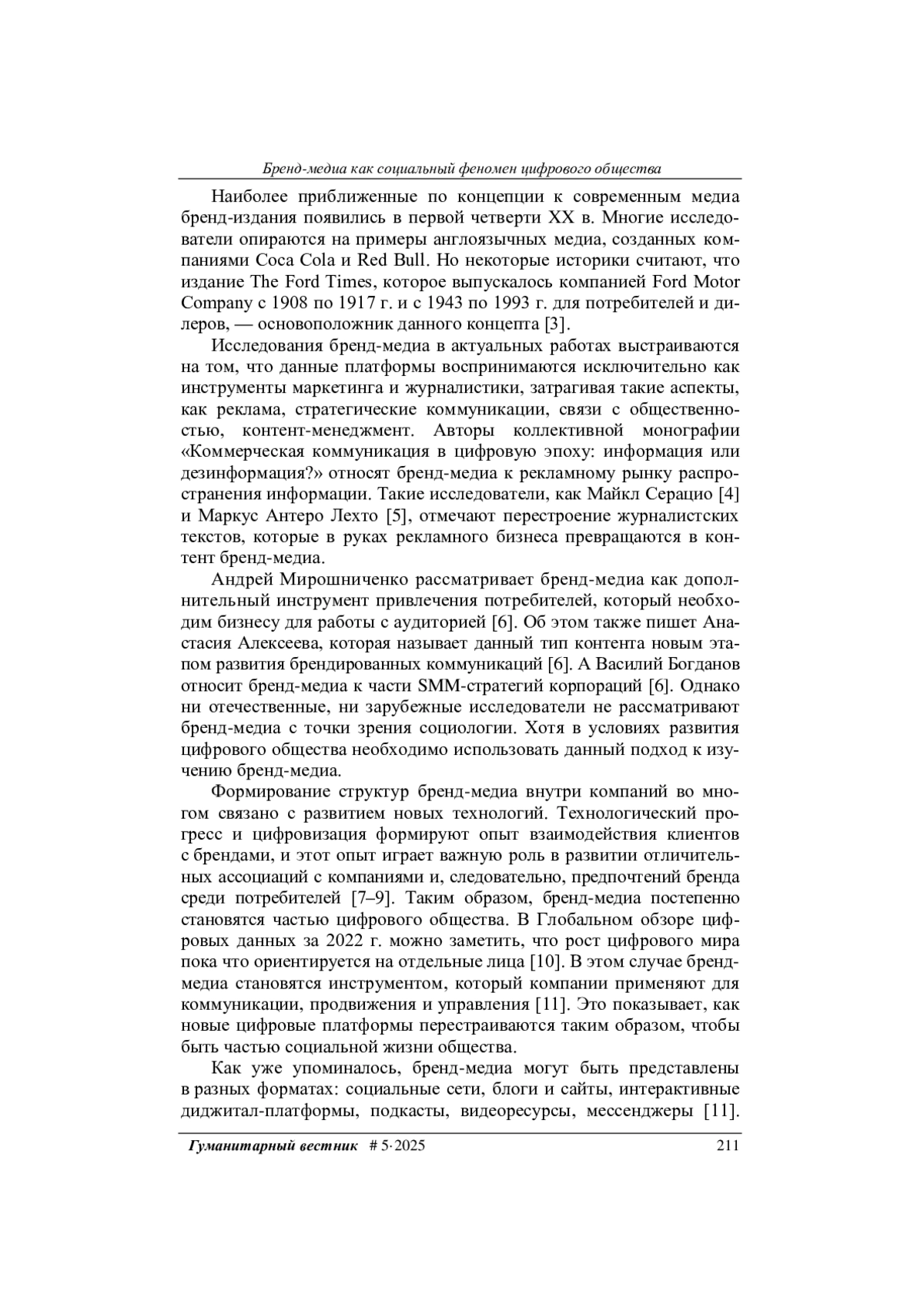 6. Нигматуллина К.Р., Павлушкина Н.А. Рынок бренд-медиа в России: определения, классификация, характеристики. Вестник Московского университета. Серия 10: Журналистика, 2022, № 6, с. 3-27.