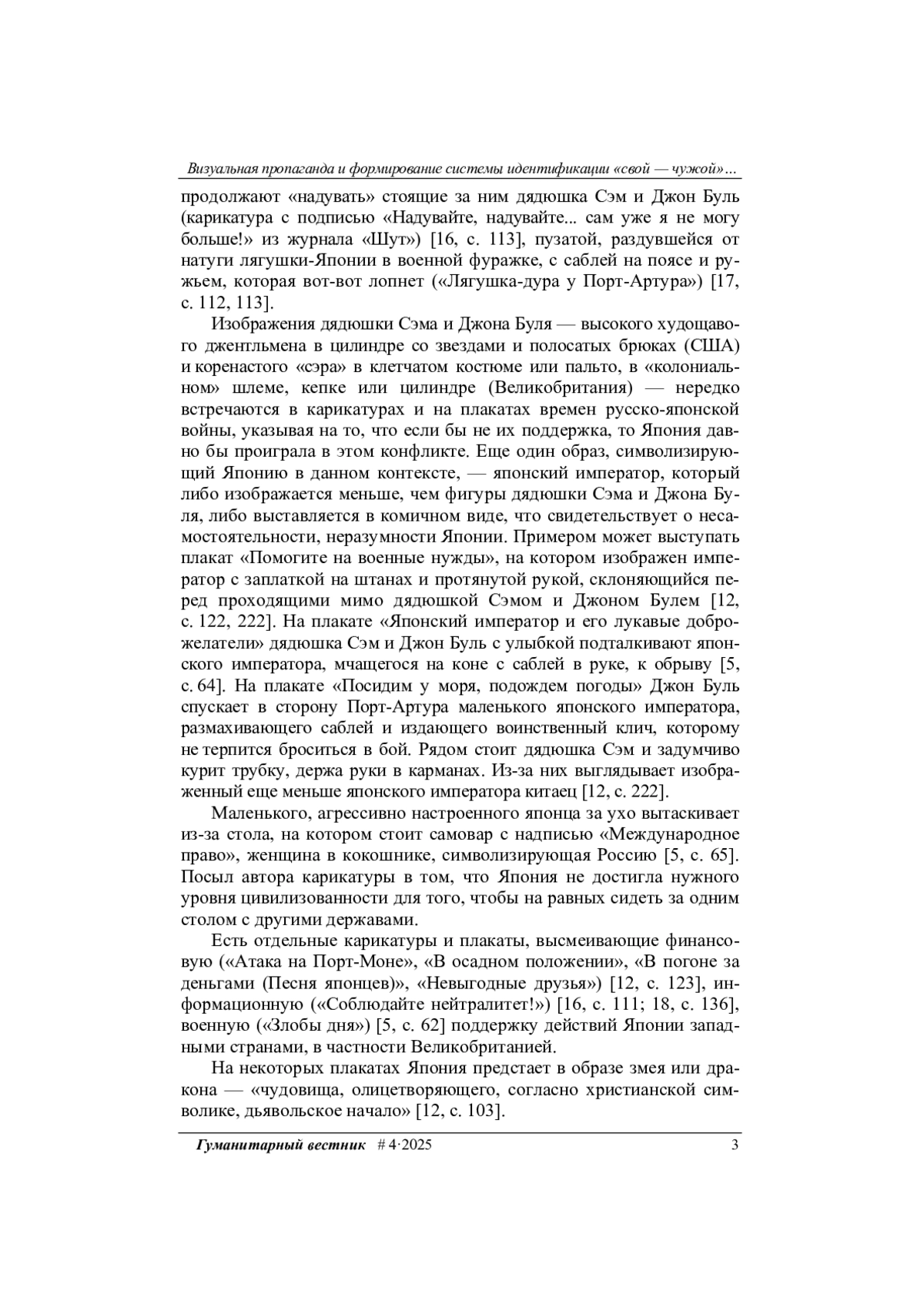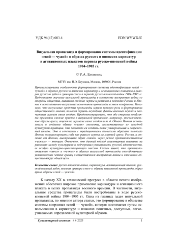 К началу ХХ в. технический прогресс в области печати изображений обеспечил широкое применение карикатуры и агитационного плаката в целях пропаганды военного времени. В частности, визуальные средства пропаганды были востребованы в ходе русскояпонской войны 1904–1905 гг. Одна из главных задач визуальной пропаганды, по мнению автора статьи, это формирование в обществе системы координат «свой — чужой», которая достигается путем использования в карикатуре и плакатах понятных, доступных, легкоузнаваемых определенной аудиторией образов.