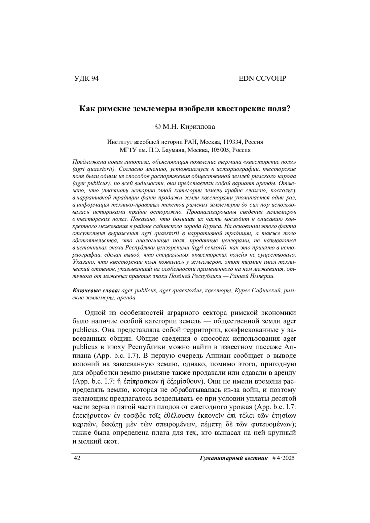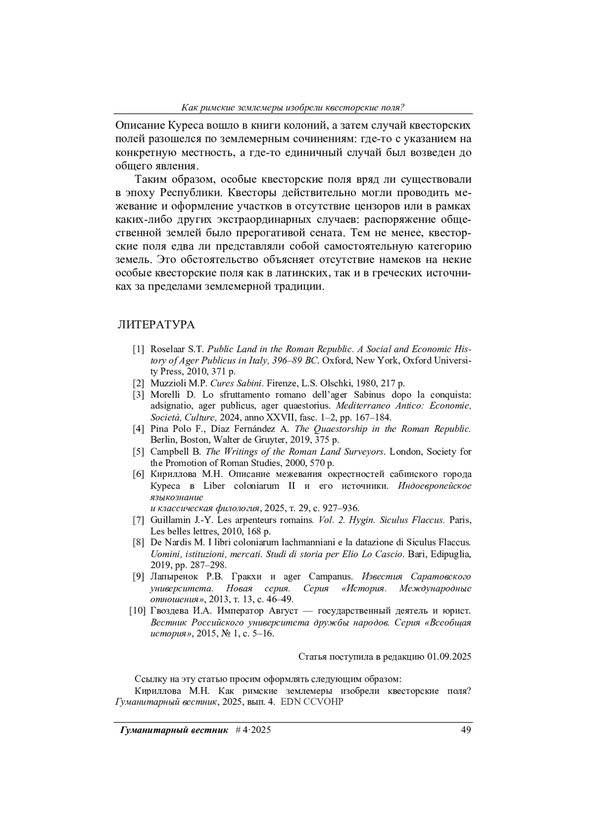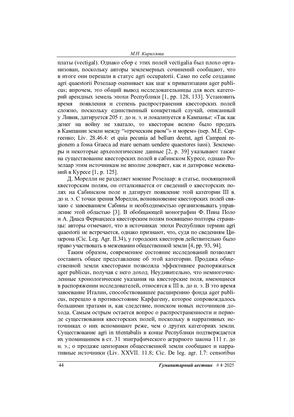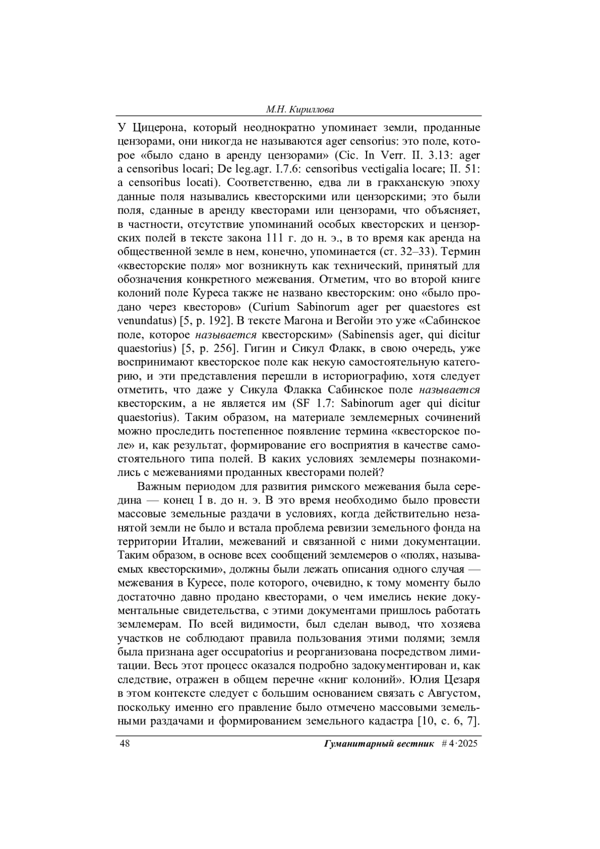 6. Кириллова М.Н. Описание межевания окрестностей сабинского города Куреса в Liber coloniarum II и его источники. Индоевропейское языкознание и классическая филология, 2025, т. 29, с. 927-936.