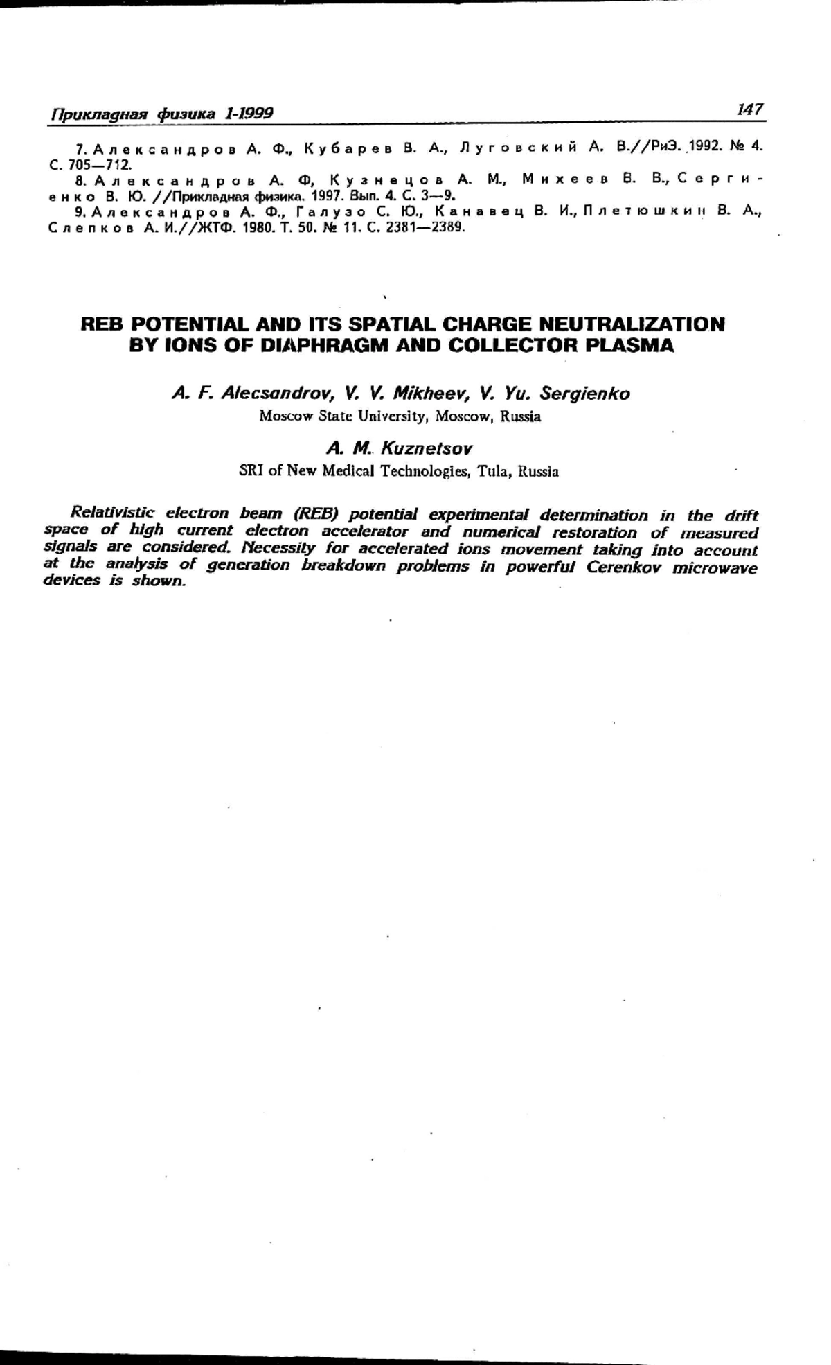 Relativistic electron beam (REB) potential experimental determination in the drift space of high current electron accelerator and numerical restoration of measured signals are considered. Necessity for accelerated ions movement taking into account at the analysis of generation breakdown problems in powerful Cerenkov microwave devices is shown.