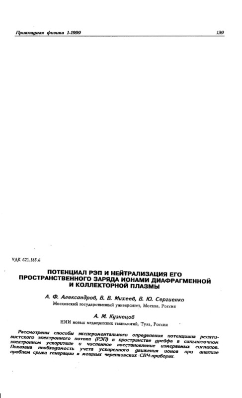 Рассмотрен способ экспериментального определения потенциала релятивистского электронного потока (РЭП) в пространстве дрейфа в сильноточном электронном ускорителе и численное восстановление измеряемых сигналов. Показана необходимость учета ускоренного движения ионов при анализе проблем срыва генерации в мощных черенковских СВЧ приборах.