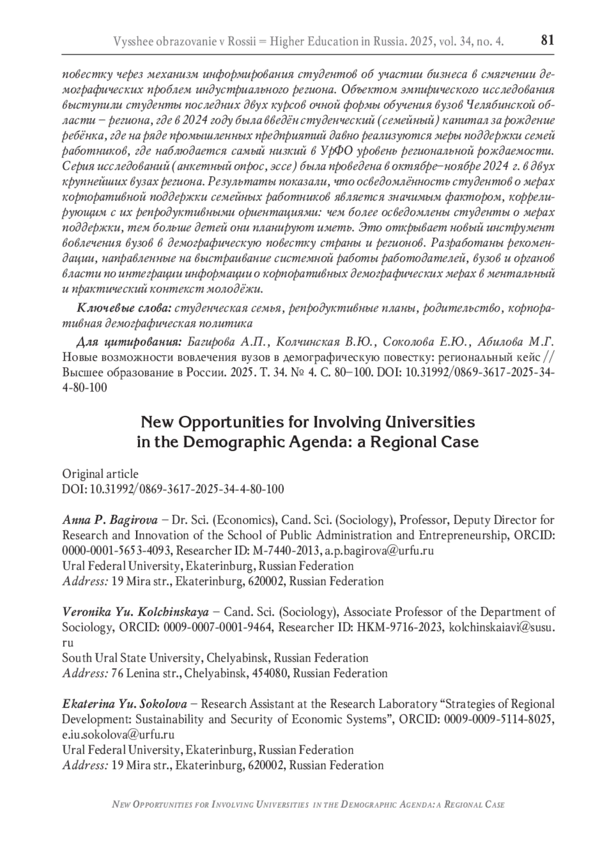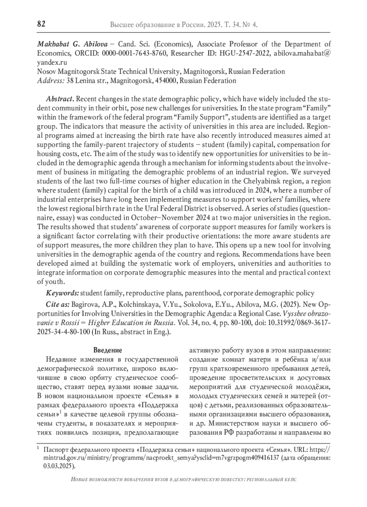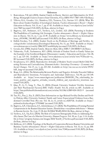 3. Багирова А.П., Нешатаев А.В., Вавилова А.С., Левшиц А.Д. Родительство в студенчестве: возможности совмещения жизненных стратегий // Высшее образование в России. 2024. Т. 33. № 7. С. 32-49. DOI: 10.31992/0869-3617-2024-33-7-32-49 EDN: JIRKHO