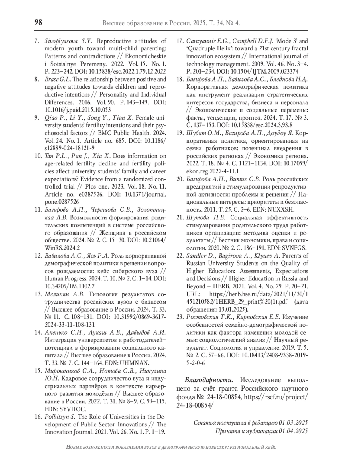 12. Вавилова А.С., Ясь Р.А. Роль корпоративной демографической политики в решении вопросов рождаемости: кейс сибирского вуза // Human Progress. 2024. Т. 10. № 2. С. 1-14. DOI: 10.34709/IM.1102.2 EDN: UQIVGJ