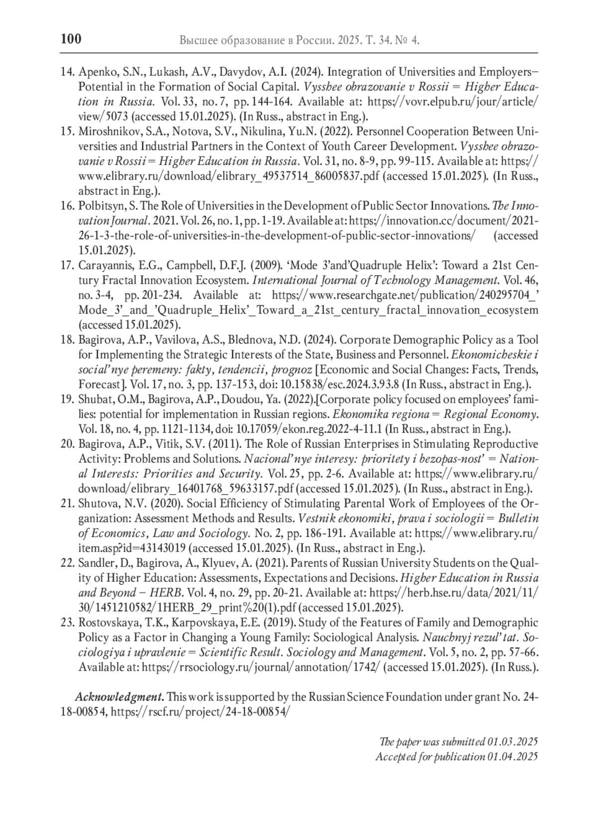 13. Меликян А.В. Типология результатов сотрудничества российских вузов с бизнесом // Высшее образование в России. 2024. Т. 33. № 11. С. 108-131. DOI: 10.31992/0869-3617-2024-33-11-108-131 EDN: IPRGRJ