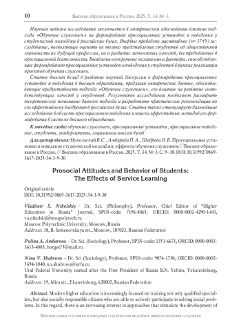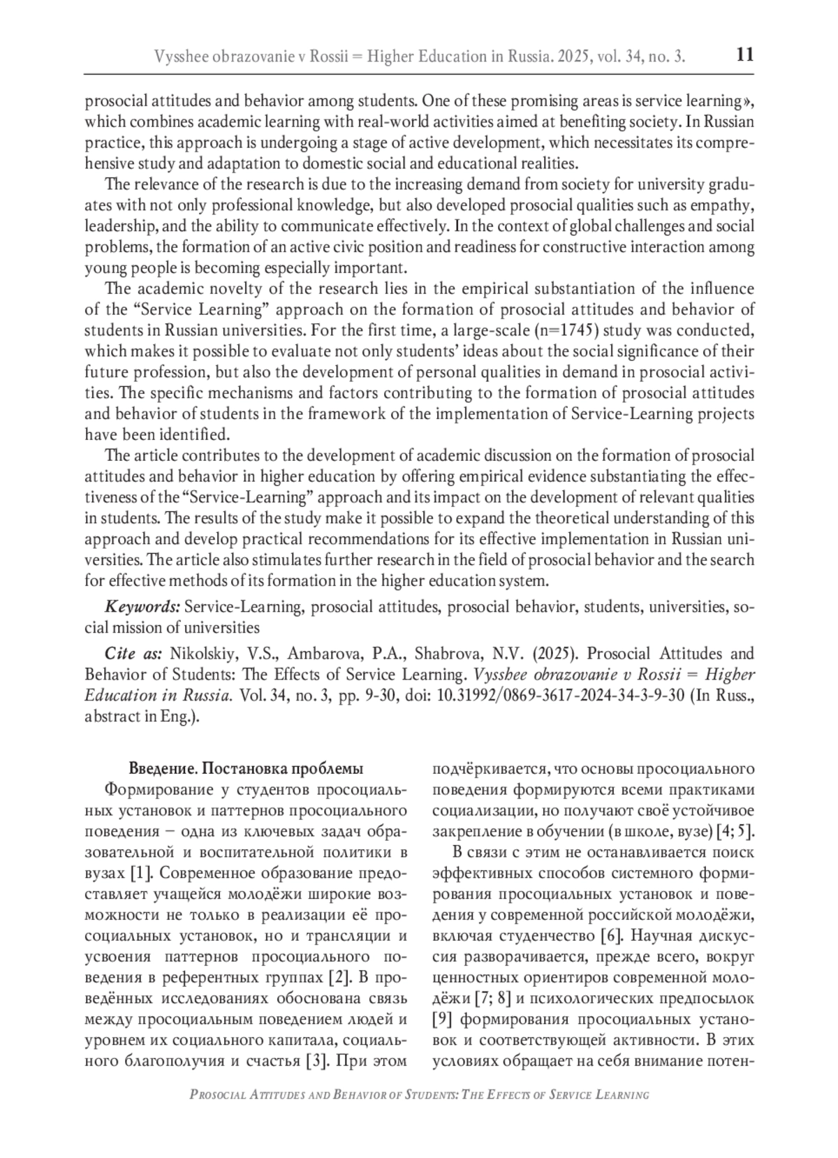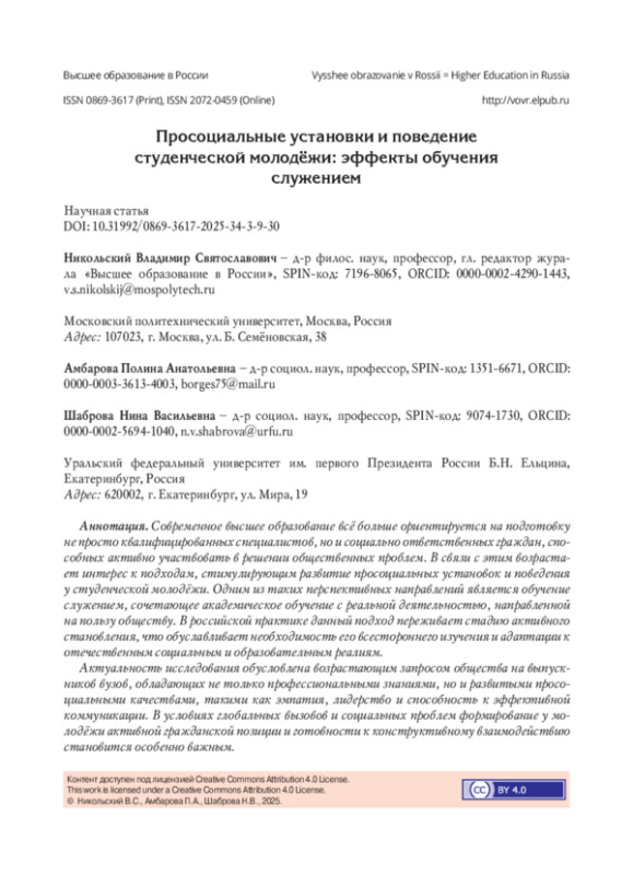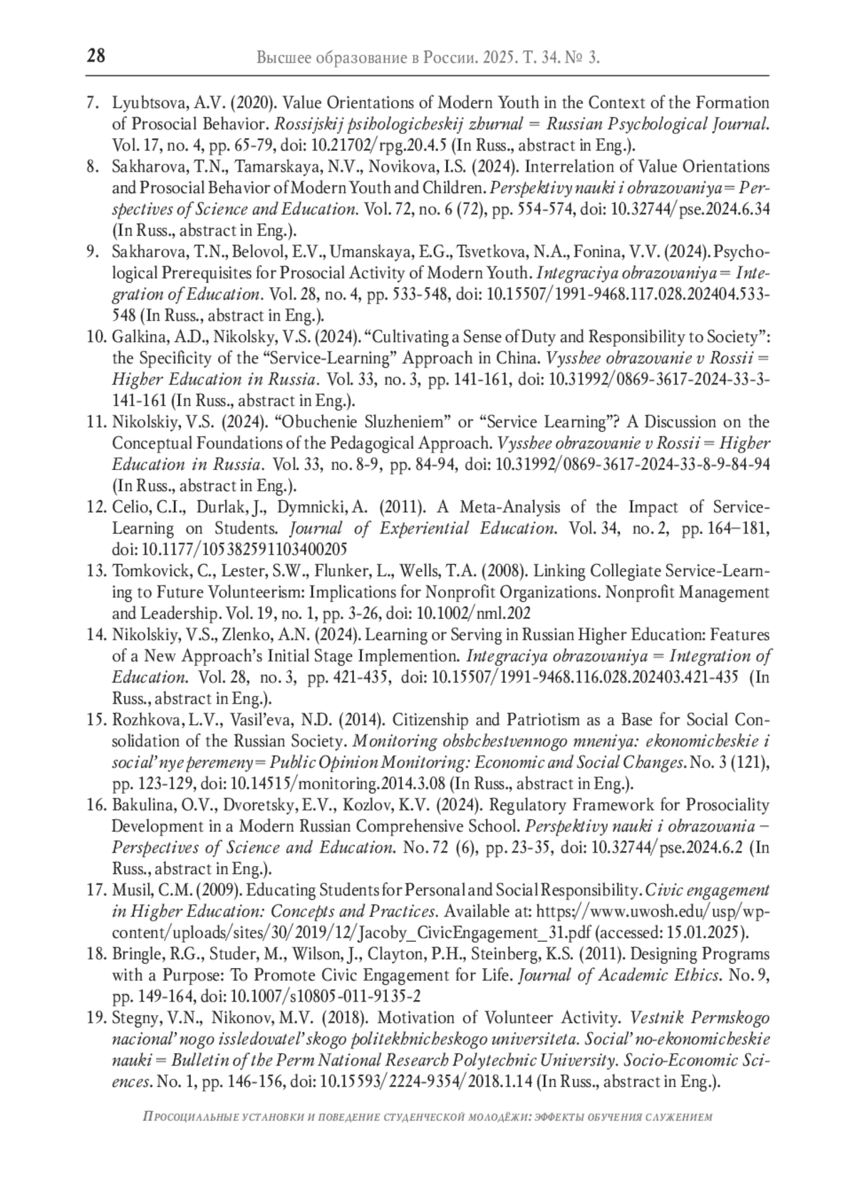 22. Никольский В.С., Амбарова П.А., Шаброва Н.В., Земцов Д.И., Метелев А.П. Готовность студентов вузов к общественному служению // Высшее образование в России. 2024. Т. 33. № 8-9. С. 9-26. DOI: 10.31992/0869-3617-2024-33-8-9-9-26 EDN: PNDHXS